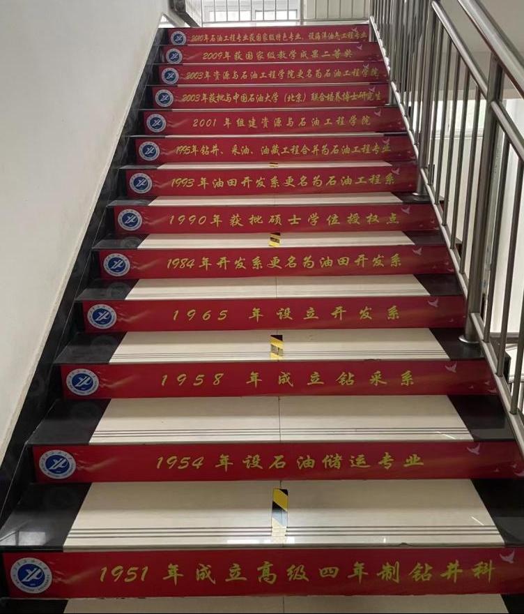 二至三層的樓梯貼紙,展現(xiàn)了學(xué)院從1951年成立高級四年制鉆井科以來的發(fā)展歷程和輝煌成就,其中包括辦學(xué)特色、專業(yè)體系、師資隊(duì)伍、教學(xué)成果、科研實(shí)力等等,旨在讓廣大師生深入了解學(xué)院的悠久歷史、發(fā)展歷程和辦學(xué)成果,弘揚(yáng)和傳承學(xué)院優(yōu)秀傳統(tǒng),展示學(xué)院發(fā)展風(fēng)貌,增強(qiáng)學(xué)生行業(yè)自信和專業(yè)自信,全面推進(jìn)學(xué)院各項(xiàng)工作高質(zhì)量發(fā)展。