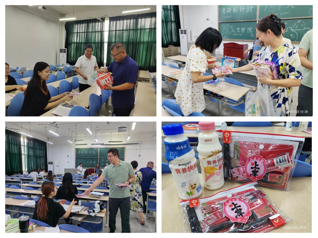 為深入了解留校學(xué)生思想動態(tài)與學(xué)習(xí)生活情況,鼓勵同學(xué)們積極備考,7月23日,人文學(xué)院黨委書記余小勇,院長方亭,副書記盛丹,副院長方松林、蘭昆以及2021級輔導(dǎo)員張馨元前往考研自習(xí)室慰問暑期留校學(xué)子,并送去考研文具、清涼飲料、零食等慰問品。