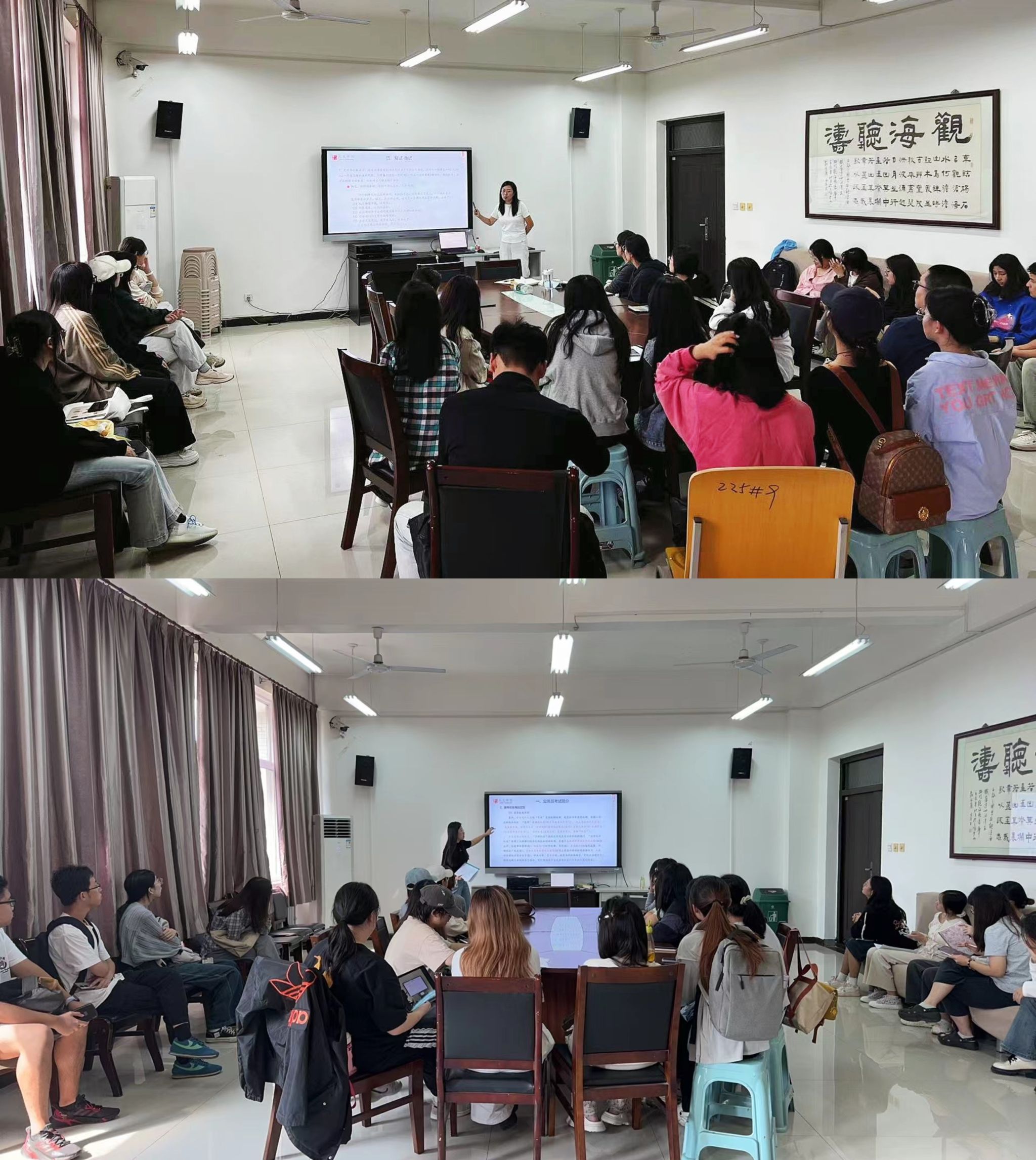 為延續(xù)2024屆畢業(yè)生13名同學在公務員考試中上岸的競爭優(yōu)勢,豐富和增加學院畢業(yè)生的就業(yè)多樣性,幫助2022級學生提前進行職業(yè)生涯規(guī)劃,精準把握公務員考試與事業(yè)單位招聘的最新動態(tài),優(yōu)化備考資源,提升備考水平,增強考試能力,營造學習氛圍。人文學院于9月25日、10月8日分兩場為2022級52名為有意向參加公考的學生舉辦公務員備考答疑座談會,由學工辦主任付強主講,輔導員范嘉欣主持。
