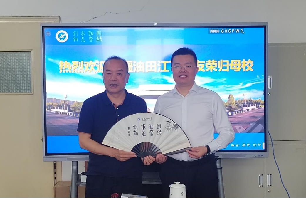 談建勤書記做了總結(jié)發(fā)言,他期望江飛校友和其他校友一道加強(qiáng)與母校、學(xué)院的聯(lián)系交流,積極促成與母校各項(xiàng)合作業(yè)務(wù)開展,不斷拓寬合作領(lǐng)域,共同為油田及母校事業(yè)發(fā)展做出應(yīng)有的貢獻(xiàn)。談建勤還向江飛校友贈(zèng)送了紀(jì)念品。