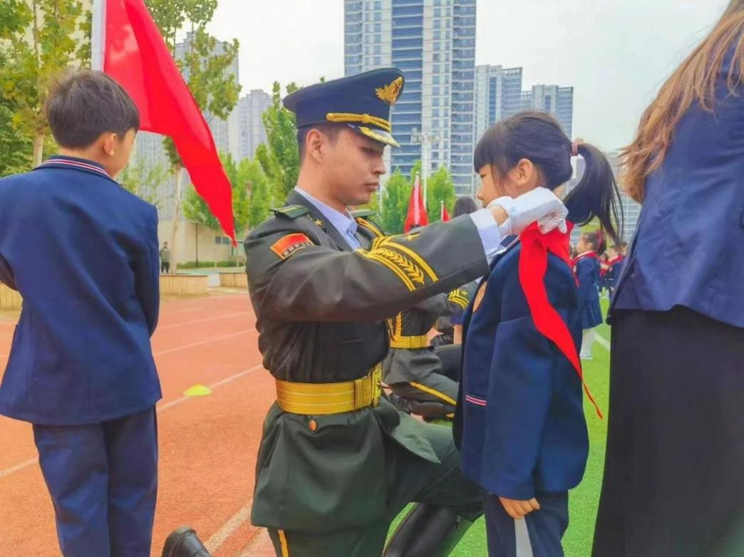 校領(lǐng)導(dǎo)、家長(zhǎng)代表、中隊(duì)輔導(dǎo)員以及我校退役大學(xué)生士兵代表為新入隊(duì)少先隊(duì)員佩戴紅領(lǐng)巾,新隊(duì)員們此刻肩負(fù)起了傳承紅色基因、弘揚(yáng)愛國(guó)精神的重任。