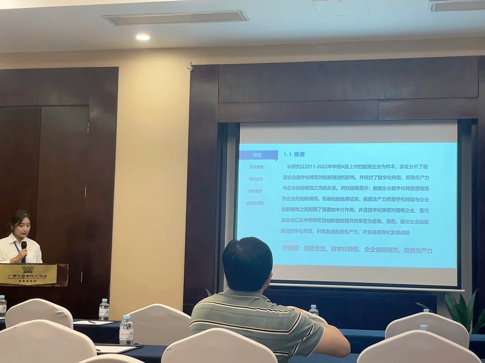 張明同學作了題為《能源企業(yè)數(shù)字化轉(zhuǎn)型與企業(yè)創(chuàng)新績效—基于新質(zhì)生產(chǎn)力的調(diào)節(jié)作用》 的專題報告。該報告介紹了能源企業(yè)數(shù)字化轉(zhuǎn)型與企業(yè)創(chuàng)新績效之間的關(guān)系,以A股上市能源企業(yè)為研究對象,實證分析了能源企業(yè)數(shù)字化轉(zhuǎn)型對創(chuàng)新績效的影響。