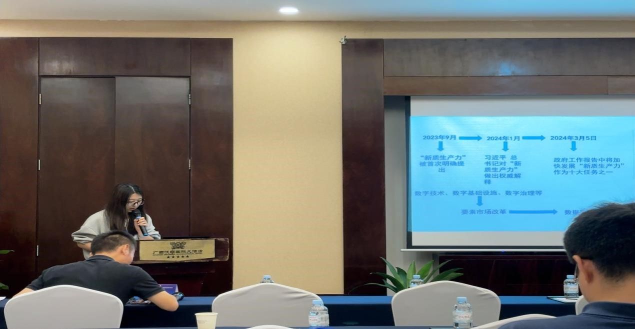 劉姿君同學作了題為《數(shù)字經(jīng)濟賦能區(qū)域新質(zhì)生產(chǎn)力發(fā)展:理論分析與實證檢驗》的專題報告。該報告基于2012-2022年中國省級面板數(shù)據(jù),通過構(gòu)建數(shù)字經(jīng)濟發(fā)展指數(shù)和新質(zhì)生產(chǎn)力指數(shù)實證檢驗數(shù)字經(jīng)濟對區(qū)域新質(zhì)生產(chǎn)力的影響,分析了數(shù)字經(jīng)濟對新質(zhì)生產(chǎn)力的門檻效應。
