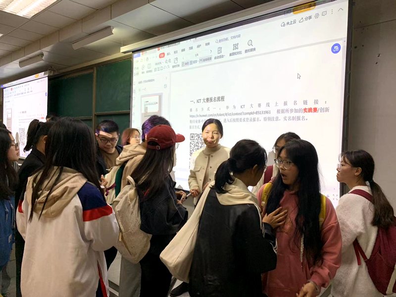 王瑤瑤首先介紹了華為公司以及設(shè)立ICT大賽的目的意義,并就剛剛結(jié)束的第八屆華為ICT大賽的賽事規(guī)模和賽事影響力做了說明。作為連續(xù)入圍中國高等教育學(xué)會發(fā)布的“全國普通高校大學(xué)生競賽排行榜”的大賽,華為ICT大賽是中國高等教育學(xué)會認(rèn)可的含金量高、參賽價值大的高校競賽項(xiàng)目之一。隨后,她重點(diǎn)介紹了第九屆華為ICT大賽中國賽的賽道規(guī)劃、賽制節(jié)點(diǎn)、參賽規(guī)則、獎項(xiàng)設(shè)置、時間安排等內(nèi)容。最后,她就泰克教育在大賽輔導(dǎo)方面的相關(guān)政策安排做了說明。同學(xué)們就自己關(guān)心的大賽話題和主講老師進(jìn)行了互動交流。現(xiàn)場氣氛熱烈,座無虛席。