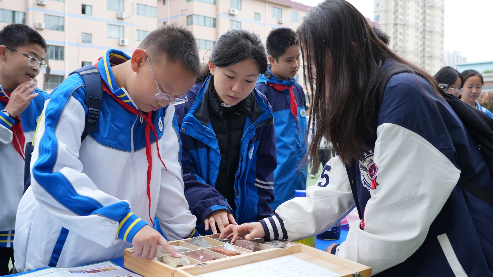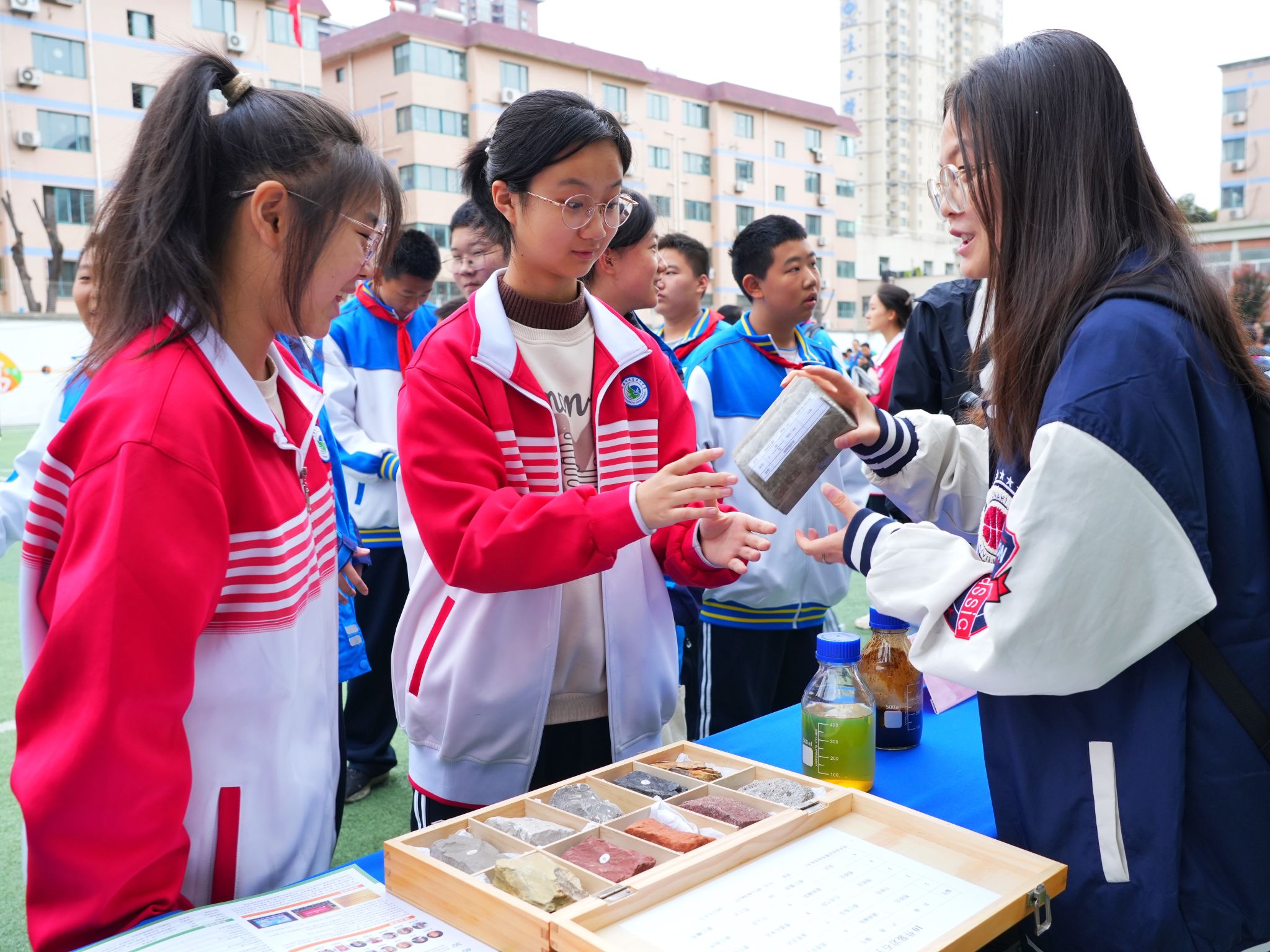 活動現(xiàn)場,科普志愿者正在向同學們講解巖石標本