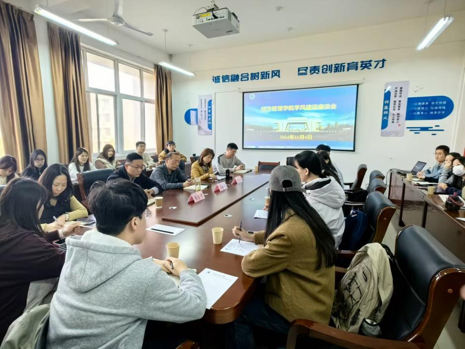 為持續(xù)改進(jìn)和加強(qiáng)學(xué)風(fēng)建設(shè),營(yíng)造良好校園學(xué)習(xí)氛圍,共建積極向上、踏實(shí)認(rèn)真、好學(xué)力行的良好學(xué)習(xí)風(fēng)氣,優(yōu)化學(xué)風(fēng)建設(shè)長(zhǎng)效機(jī)制,經(jīng)濟(jì)管理學(xué)院于11月4日下午在崇文樓305會(huì)議室召開學(xué)風(fēng)建設(shè)座談會(huì)。經(jīng)濟(jì)管理學(xué)院黨委書記談建勤、院長(zhǎng)王君萍、黨委副書記楊生強(qiáng),學(xué)生工作辦公室主任李博文、各年級(jí)輔導(dǎo)員及學(xué)生代表參會(huì)。