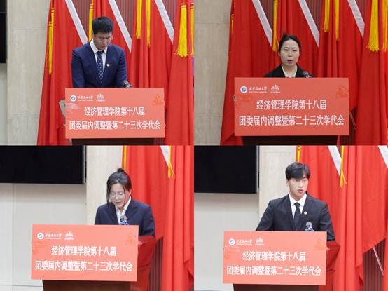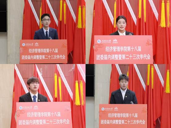 會(huì)上,學(xué)院團(tuán)委書記李博文宣讀了《共青團(tuán)西安石油大學(xué)經(jīng)濟(jì)管理學(xué)院委員會(huì)關(guān)于第十八屆委員會(huì)組織成員調(diào)整任命的通知》,新任團(tuán)委委員依次表態(tài)發(fā)言。團(tuán)學(xué)指導(dǎo)老師任仰宣讀了《第二十三次學(xué)生代表大會(huì)選舉辦法》,與會(huì)代表選舉產(chǎn)生了新一屆學(xué)生委員會(huì)委員。石油工程學(xué)院學(xué)生會(huì)執(zhí)行主席李陽代表各兄弟院(系)學(xué)生會(huì)致以祝詞,對經(jīng)濟(jì)管理學(xué)院團(tuán)學(xué)工作的成績表示祝賀,表示將保持密切聯(lián)系,攜手共進(jìn)。大會(huì)聽取并審議通過了《大會(huì)籌備工作報(bào)告》《第二十二屆學(xué)生會(huì)年度工作報(bào)告》和《大會(huì)提案工作報(bào)告》,新任團(tuán)委委員、當(dāng)選學(xué)生委員會(huì)委員面向團(tuán)旗進(jìn)行了莊嚴(yán)宣誓。