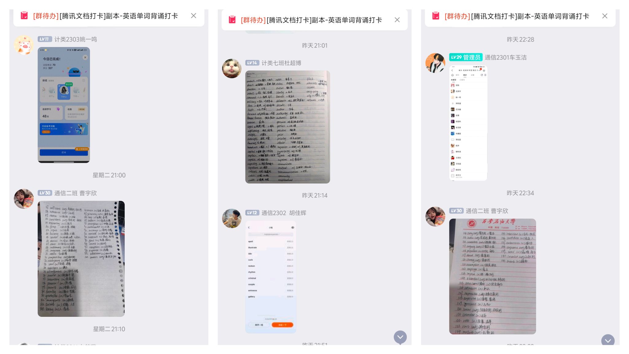 英語四級考試,單詞是基本功。為了夯實(shí)備考學(xué)生的單詞基本功,學(xué)院分年級組織學(xué)生開展“每日英語單詞背誦打卡”活動,將學(xué)生喜聞樂見的“打卡”方式與每日英語學(xué)習(xí)有效結(jié)合,變“單兵作戰(zhàn)”為“集體同頻”,有效增強(qiáng)了學(xué)生堅(jiān)持的能動性和學(xué)習(xí)的主動性。