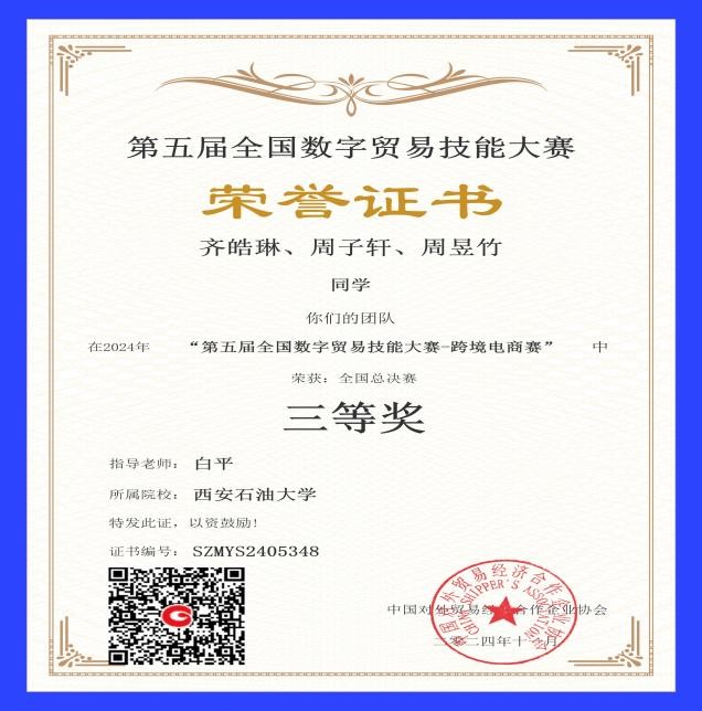 2024年11月20日-11月24日,由中國(guó)對(duì)外貿(mào)易經(jīng)濟(jì)合作企業(yè)協(xié)會(huì)主辦,南京步驚云軟件有限公司承辦的“第五屆全國(guó)數(shù)字貿(mào)易技能大賽跨境電商賽項(xiàng)”成功舉辦。來自全國(guó)217所本科、高職、中職院校的3592支隊(duì)伍共計(jì)10776人參加了比賽,其中中職組232支隊(duì)伍,選手696人;高職組1251支隊(duì)伍,選手3753人;本科組2109支隊(duì)伍,選手6327人。經(jīng)過五天的激烈角逐,由白平老師指導(dǎo)的1支參賽隊(duì)伍在本次比賽中榮獲全國(guó)三等獎(jiǎng)。
