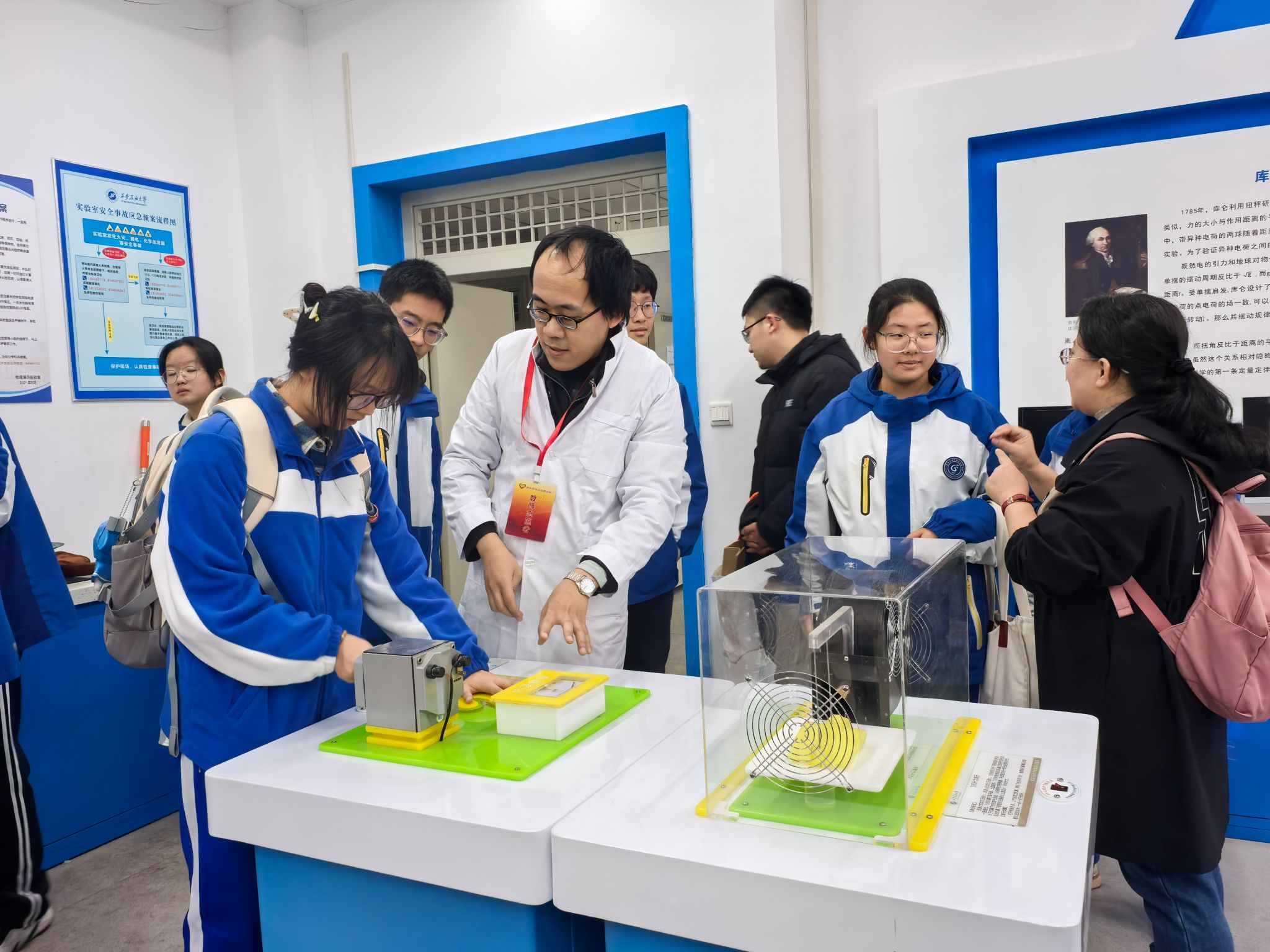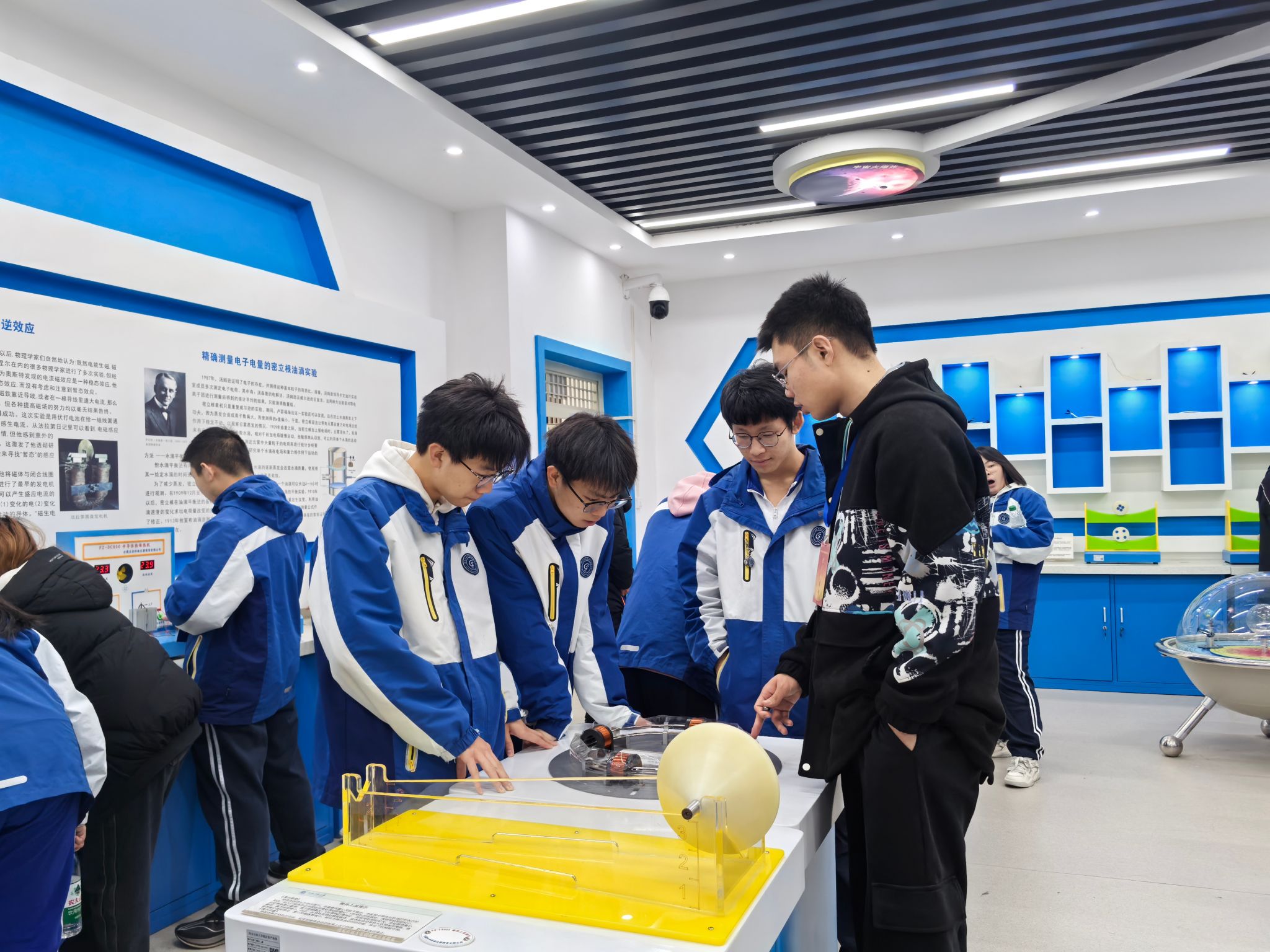 研學(xué)活動第二站來到理學(xué)院物理演示實驗室。物理演示實驗室是陜西省科普教育基地,是集圖像演示、實物操作等功能為一體的開放性實驗室,涵蓋了力學(xué)、電磁學(xué)、光學(xué)、熱學(xué)等方面知識。理學(xué)院師生志愿者分組帶領(lǐng)五高師生進(jìn)入實驗室,逐一演示了引人入勝的雅各布天梯,生動展現(xiàn)了電流的神秘躍動等,讓參觀者直觀感受到能量轉(zhuǎn)換的奇妙過程;震撼人心的電磁炮發(fā)射,以直觀、震撼的方式詮釋了電磁力的強(qiáng)大威力。這些精心設(shè)計的演示活動,不僅激發(fā)了學(xué)生對物理學(xué)奧秘的好奇心與探索欲,更為大家搭建起了一座通往科學(xué)殿堂的橋梁,讓物理之美躍然眼前,深入人心。