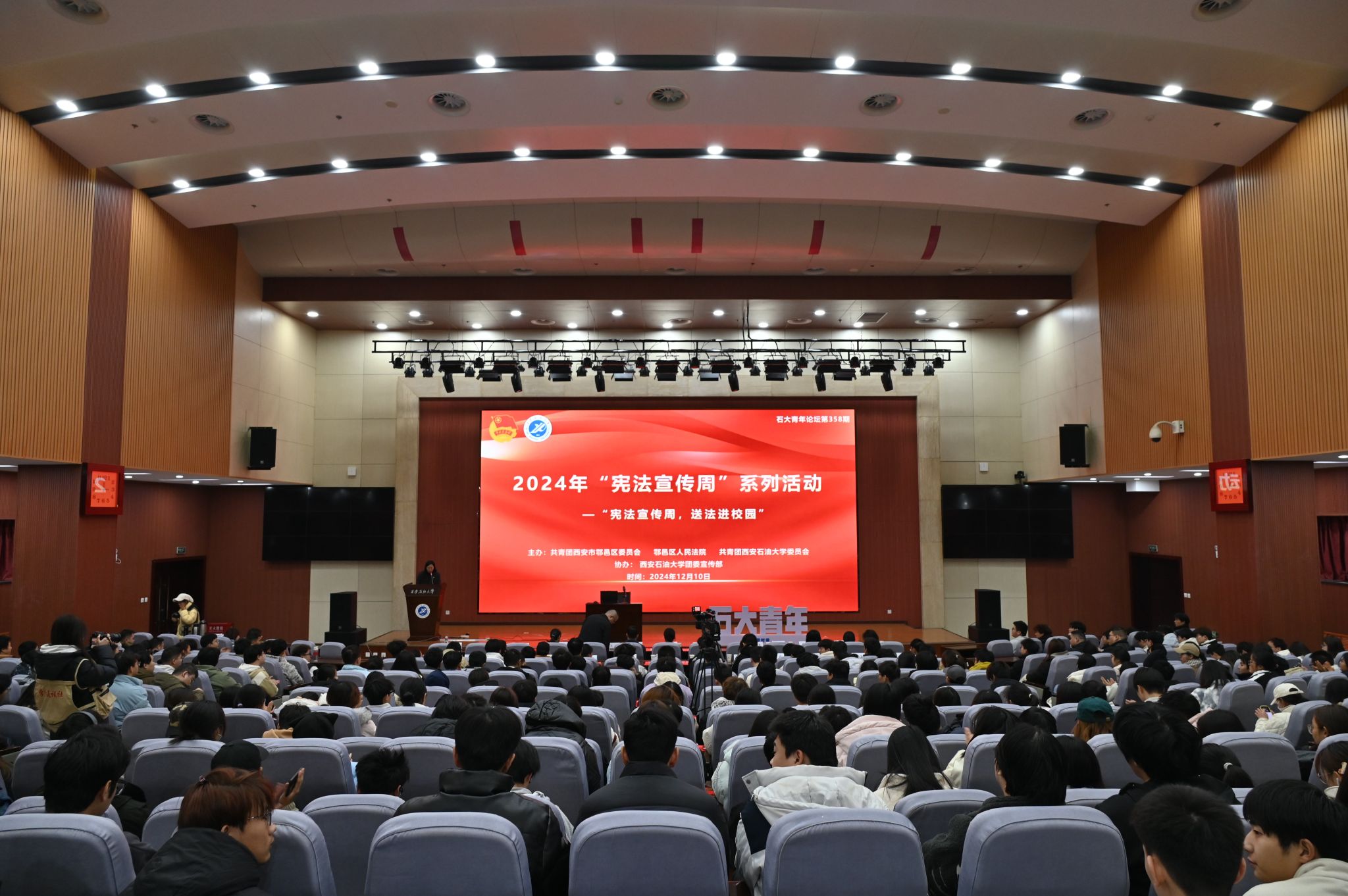為促進(jìn)我校大學(xué)生深入學(xué)習(xí)憲法知識(shí)、維護(hù)憲法權(quán)威,營(yíng)造校園法治氛圍,12月10日下午,校團(tuán)委聯(lián)合西安市鄠邑區(qū)人民法院,在鄠邑校區(qū)弘石學(xué)術(shù)報(bào)告廳開(kāi)展2024年“憲法宣傳周”系列活動(dòng)—“憲法宣傳周,送法進(jìn)校園”主題的石大青年論壇。西安市鄠邑區(qū)人民法院一級(jí)法官?gòu)堄昵?、法官助理?xiàng)钕驑s主講,共青團(tuán)西安市鄠邑區(qū)委員會(huì)書記張洪雷、西安石油大學(xué)團(tuán)委書記王剛、西安市鄠邑區(qū)人民法院團(tuán)支部書記叢雅晨、西安市鄠邑區(qū)青聯(lián)委員、青企協(xié)會(huì)員、鄉(xiāng)創(chuàng)客聯(lián)盟成員代表出席。我校400余名學(xué)生參加本次論壇。