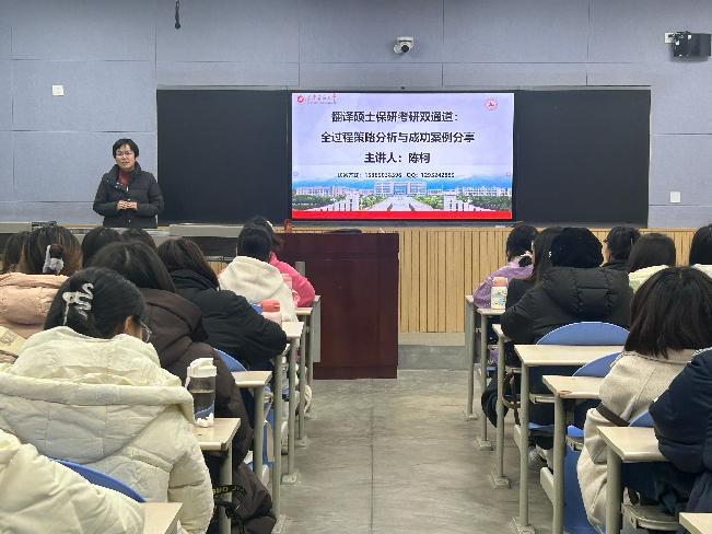 12月24日上午,外國(guó)語(yǔ)學(xué)院在鄠邑校區(qū)博覽樓A219啟動(dòng)2026屆考研動(dòng)員系列講座,本次邀請(qǐng)學(xué)院MTI翻譯碩士教學(xué)中心陳柯教授面向翻譯專(zhuān)業(yè)學(xué)生開(kāi)展專(zhuān)題講座,學(xué)院60余名學(xué)生參加。