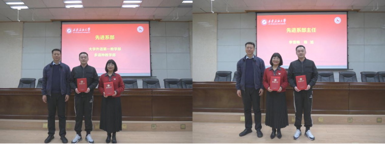 會上,學(xué)院黨委副書記邱嶺宣讀了表彰決定,授予畢瑩等32名教師“先進教師”榮譽稱號,授予大學(xué)外語第一教學(xué)部等4個系部和黨支部“先進集體”榮譽稱號,同時授予李雪梅等4名教師“先進系部主任和黨支部書記”榮譽稱號。隨后,學(xué)院黨委書記張建高、副書記邱嶺、副院長陳武及工會主席王文峰為獲獎教師頒發(fā)了榮譽證書,并合影留念。
