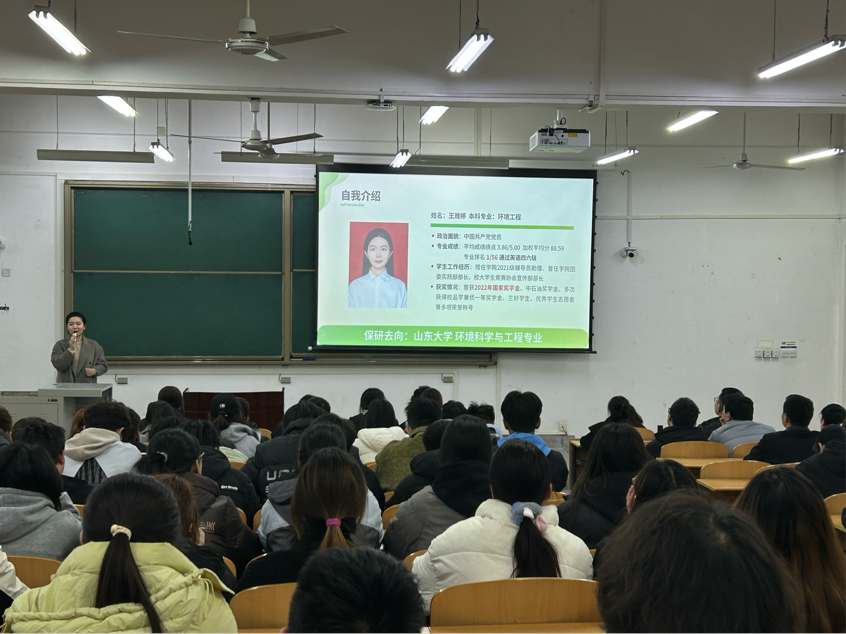 活動(dòng)中,2021級(jí)環(huán)境工程專業(yè)的優(yōu)秀學(xué)生代表王雅婷同學(xué),毫無(wú)保留地分享了她的保研經(jīng)驗(yàn)。王雅婷憑借優(yōu)異的學(xué)業(yè)成績(jī)和突出的綜合表現(xiàn),成功保研至山東大學(xué)環(huán)境科學(xué)與工程學(xué)院。她從學(xué)業(yè)成績(jī)的積累、科研經(jīng)歷的打磨、競(jìng)賽成果的獲取,再到面試技巧的掌握等多個(gè)維度,細(xì)致入微地講述了自己的保研歷程。她還分享了自己在日常學(xué)習(xí)中的獨(dú)到方法,比如如何高效地整理知識(shí)點(diǎn)、如何制定合理的學(xué)習(xí)計(jì)劃等。她鼓勵(lì)同學(xué)們積極投身學(xué)科競(jìng)賽、社會(huì)實(shí)踐以及科研活動(dòng),主動(dòng)與老師溝通交流,在老師的指導(dǎo)下提升科研能力。同時(shí),也不能忽視團(tuán)隊(duì)協(xié)作與解決問(wèn)題能力的培養(yǎng),這些能力在未來(lái)的學(xué)習(xí)和工作中都至關(guān)重要。