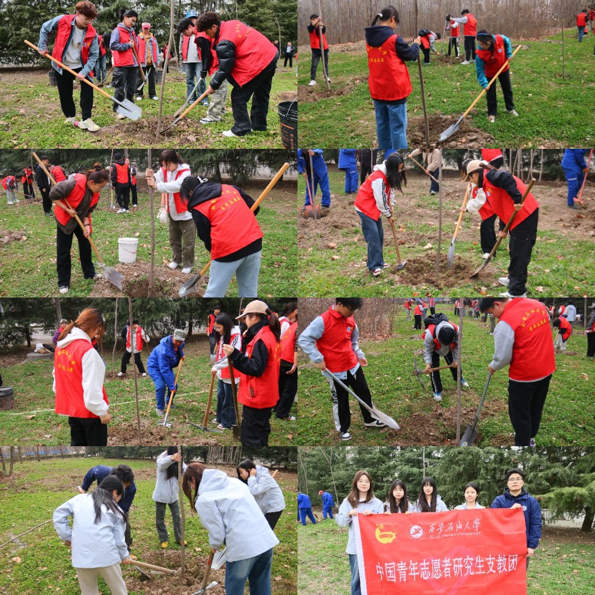 植樹現(xiàn)場,大家配合默契、干勁十足,揮鍬鏟土、扶樹定根、培土圍堰、提桶澆水,每一個步驟都凝聚著廣大師生的熱情與汗水,在大家的共同努力下,一排排新栽的樹苗在春風中挺立,為校園增添了勃勃生機。