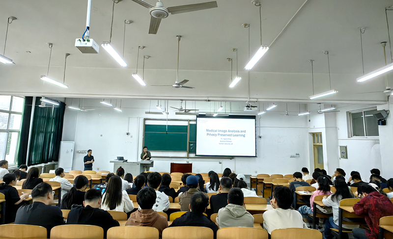 鄧晶晶博士2017年于英國斯旺西大學(xué)計(jì)算機(jī)系斬獲計(jì)算視覺博士學(xué)位,后入職杜倫大學(xué)計(jì)算機(jī)科學(xué)系的VIViD小組,同時(shí)聯(lián)合多所高校牽頭創(chuàng)建JLAI實(shí)驗(yàn)室,領(lǐng)導(dǎo)Rand2AI研究小組,致力于前沿計(jì)算模型開發(fā),其在聯(lián)邦學(xué)習(xí)的醫(yī)學(xué)健康數(shù)據(jù)隱私研究領(lǐng)域成果突出,贏得NVIDIA、Intel、AMD等業(yè)界巨擘的青睞與支持。鄧博士通過圖文結(jié)合的方式,深入淺出地講解了醫(yī)學(xué)圖像處理前沿技術(shù)以及隱私保護(hù)的關(guān)鍵要點(diǎn),結(jié)合實(shí)例闡述計(jì)算機(jī)相關(guān)專業(yè)理論。講座結(jié)尾還進(jìn)行了提問互動環(huán)節(jié),現(xiàn)場氣氛輕松熱烈。此次講座為師生們進(jìn)一步打開了思維視野,豐富了研究方向,拓寬了學(xué)術(shù)邊界。