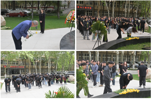 隨后,全體師生莊嚴肅穆,面向唐春雨烈士雕像默哀一分鐘,依次向唐春雨烈士敬獻鮮花并鞠躬致敬。