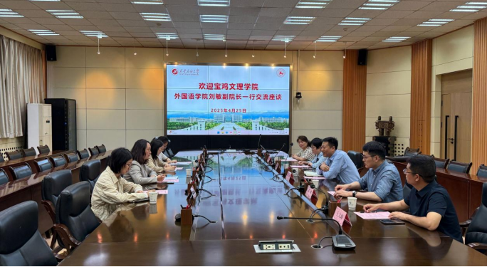 4月25日上午,寶雞文理學院外國語學院劉敏副院長帶隊來我校外國語學院座談交流。座談交流會在雁塔校區(qū)會議中心第二會議室召開,外國語學院副院長陳武、翻譯碩士學位點負責人鄧林、翻譯碩士教學與研究中心主任陳柯、研究生公共外語教學部主任張虹、英語系黨支部書記王文峰參加座談會。座談會由外國語學院副院長陳武主持。