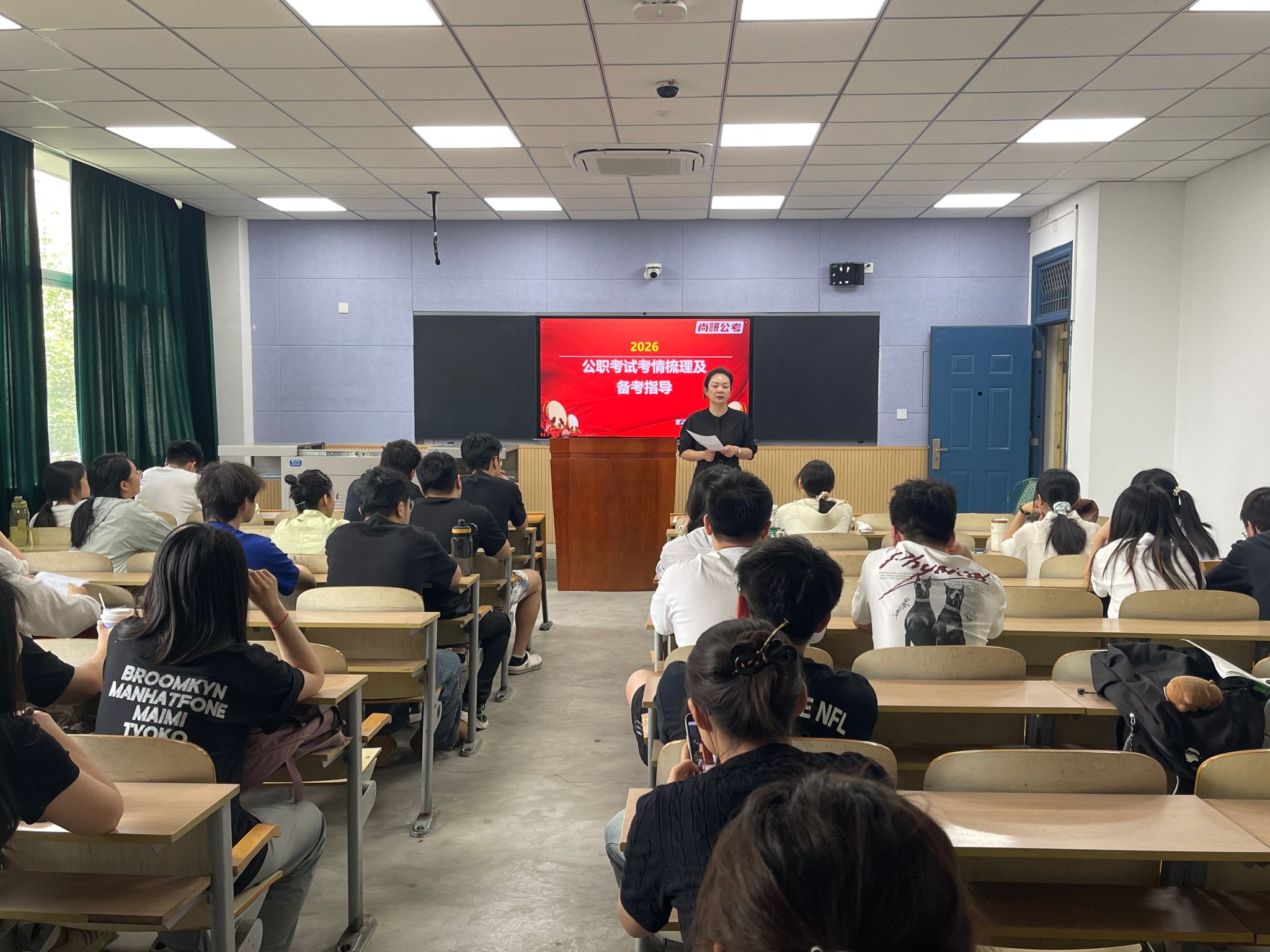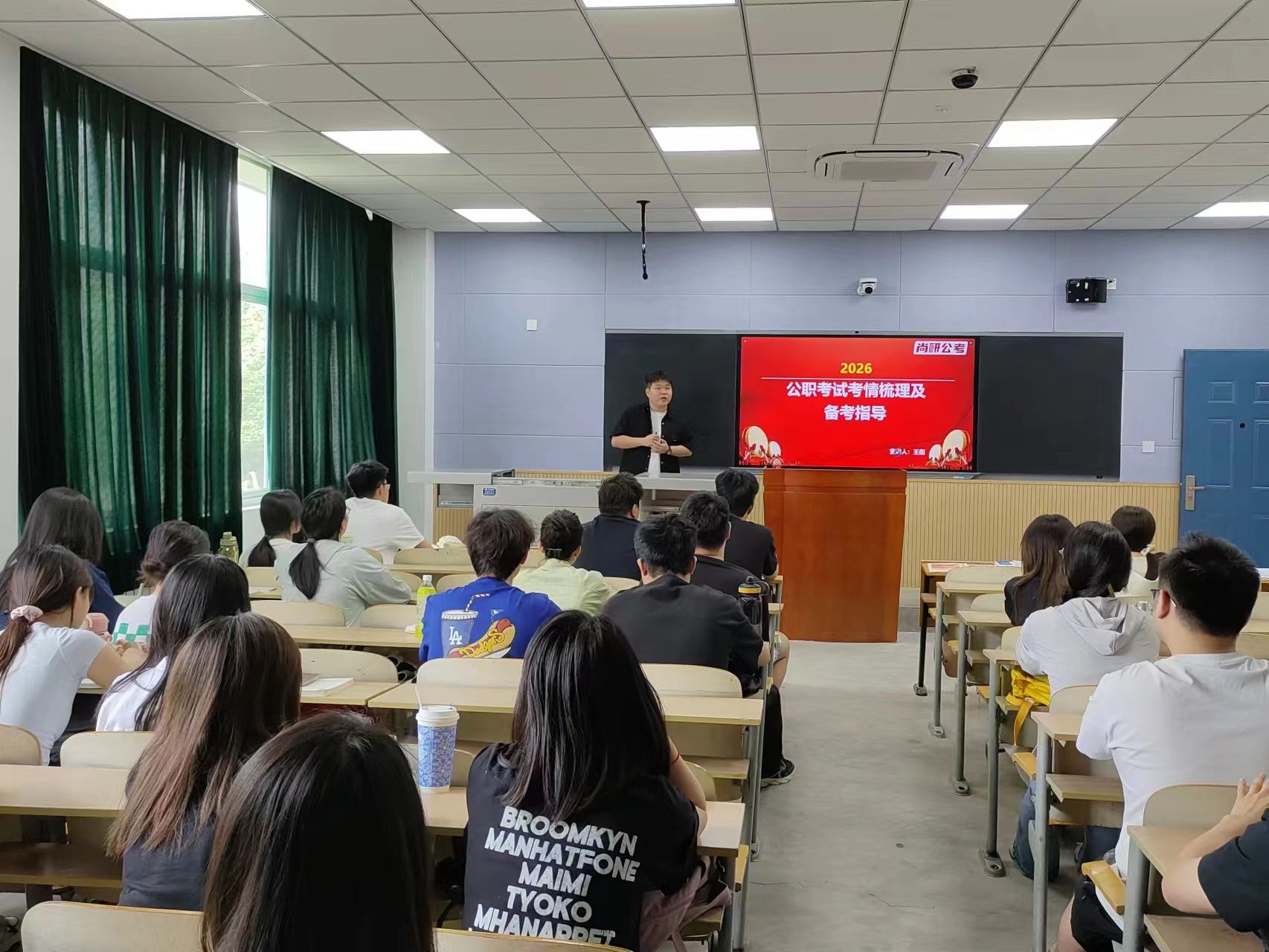 隨后,王蘅圍繞公考趨勢與備考策略展開專題指導(dǎo)。他以歷年數(shù)據(jù)為依托,深入分析了國考、省考、軍隊(duì)文職及事業(yè)單位考試的招錄條件、競爭程度以及崗位特點(diǎn),并為學(xué)生預(yù)測了2026年考情變化趨勢。他指出:“要上岸,選對方向是關(guān)鍵。公職考試沒有最好的,只有最合適的。要結(jié)合自身專業(yè)背景以及未來發(fā)展規(guī)劃合理選擇?!?針對備考痛點(diǎn),王蘅為學(xué)生詳細(xì)講解了行測和申論的知識框架體系以及備考日程規(guī)劃,為學(xué)生們分享了許多切實(shí)有效的方法和技巧,幫助學(xué)生構(gòu)建科學(xué)備考體系。