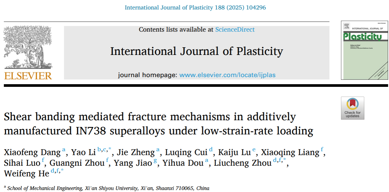近日,我校機(jī)械工程學(xué)院青年教師黨曉鳳為第一作者、西安石油大學(xué)為第一單位,在塑性力學(xué)領(lǐng)域國際頂級(jí)期刊《International Journal of Plasticity》(中科院一區(qū)TOP期刊,IF=9.4)上發(fā)表了題為《Shear banding mediated fracture mechanisms in additively manufactured IN738 superalloys under low-strain-rate loading》的最新研究成果。合作者包括我校鄭杰副教授和竇益華教授。