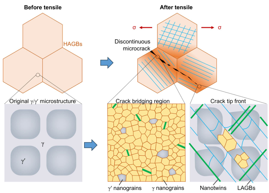 本研究首次揭示了EBPBF制備的IN738高溫合金在低應(yīng)變率(1×10?3 s?1)拉伸載荷下剪切帶介導(dǎo)的斷裂新機(jī)制。通過優(yōu)化電子束掃描策略與熱場控制,成功制備出缺陷率低、柱狀晶<001>織構(gòu)顯著的致密高溫合金,其性能優(yōu)于鑄造IN738合金。研究發(fā)現(xiàn),EBPBF工藝制備的高溫合金中納米碳化物均勻分布,有效抑制裂紋萌生,并通過剪切帶作用實(shí)現(xiàn)穿晶斷裂。裂紋擴(kuò)展路徑中形成的剪切帶伴隨γ'強(qiáng)化相納米化與動(dòng)態(tài)再結(jié)晶現(xiàn)象,通過位錯(cuò)滑移與孿生協(xié)同作用耗散裂紋能量,顯著提升了合金的裂紋擴(kuò)展阻力。該研究為高性能高溫合金的可靠性設(shè)計(jì)提供了理論支撐。