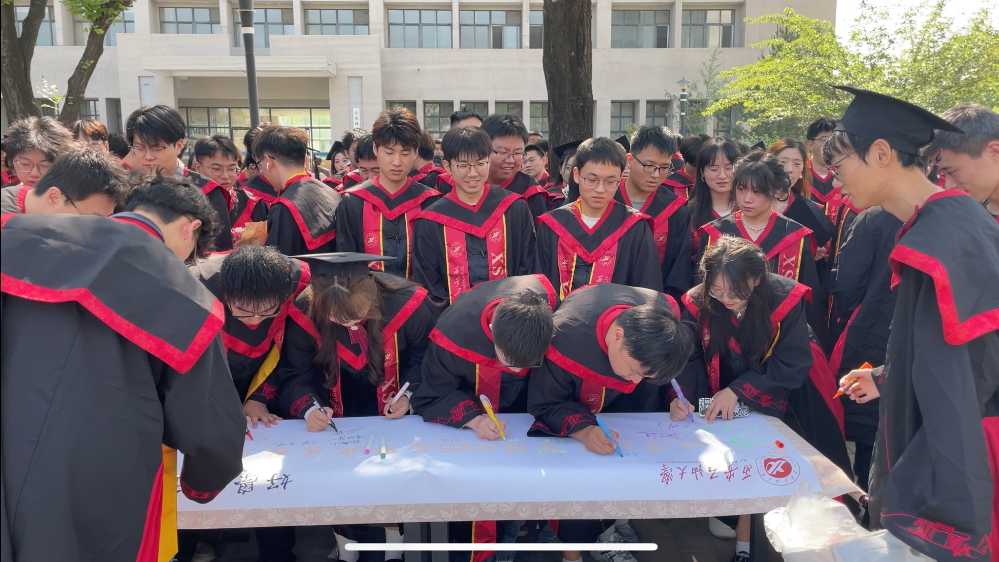 活動現(xiàn)場,長長的卷軸在廣場上徐徐展開,猶如一幅承載著青春記憶的畫卷。畢業(yè)生們紛紛拿起筆,在卷軸上鄭重簽下自己的姓名,一筆一劃,飽含著對母校的深深眷戀,也定格了大學(xué)時光的珍貴瞬間。