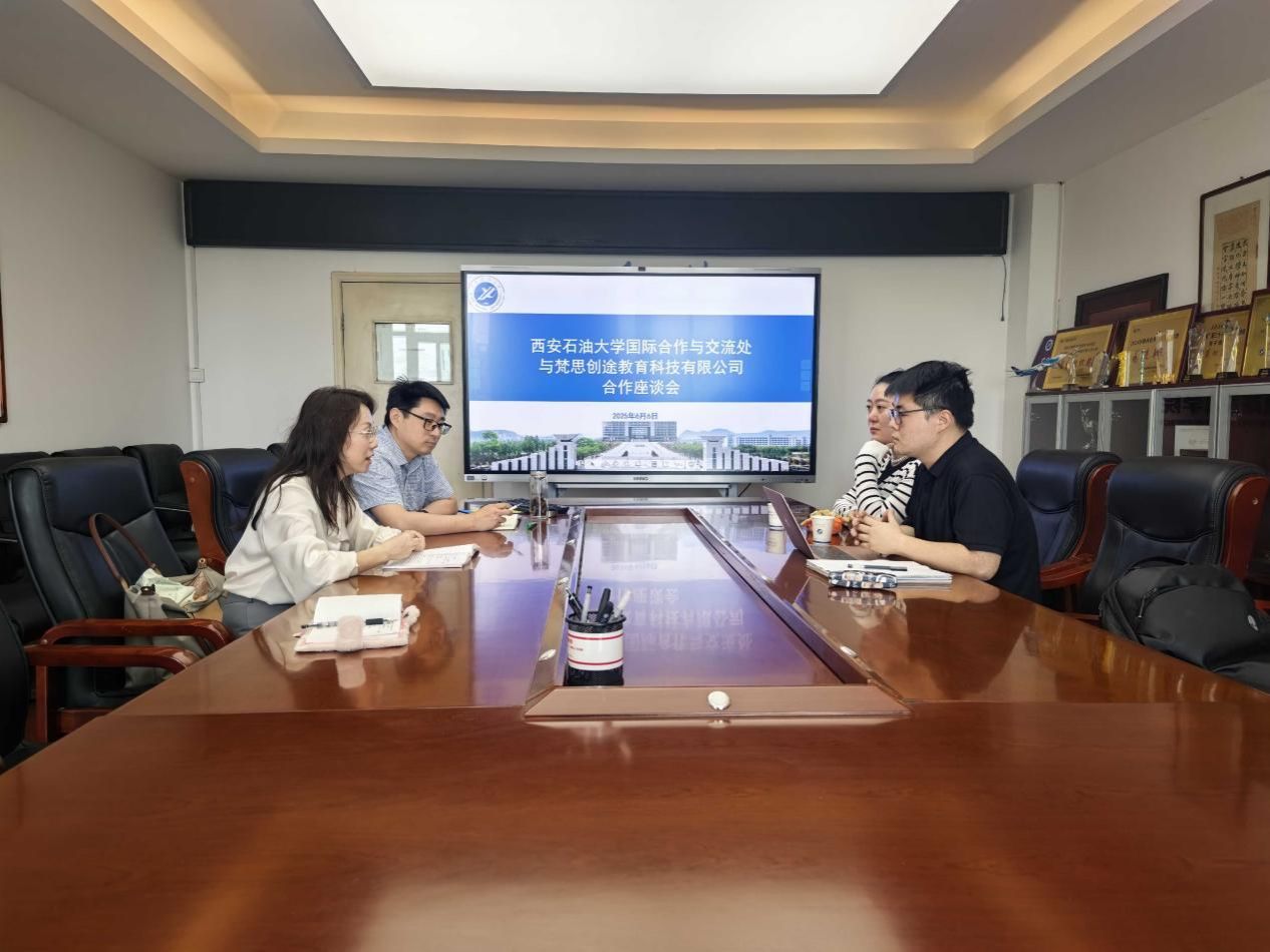 2025年6月6日上午,陜西梵思創(chuàng)途教育科技有限公司代表一行2人來(lái)校,在雁塔校區(qū)東方石油樓801開展合作座談。會(huì)議由國(guó)際合作及交流處處長(zhǎng)董皓主持。