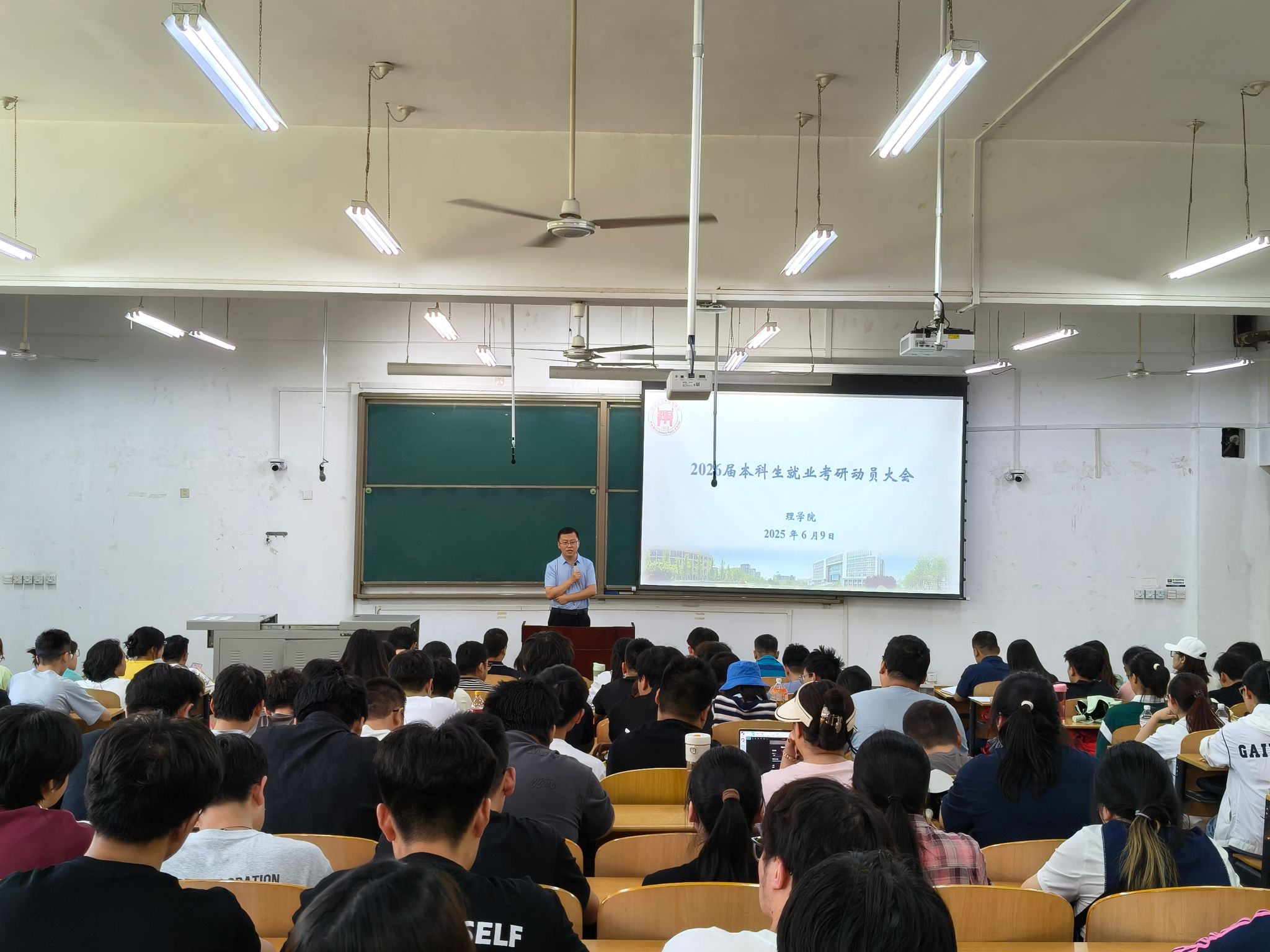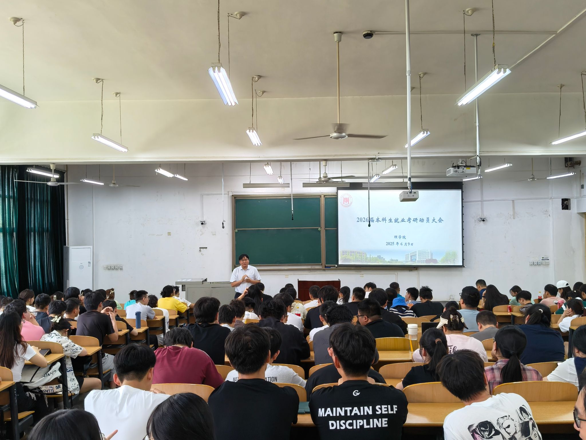 為扎實做好2026屆本科生就業(yè)考研工作,助力學(xué)生明確職業(yè)目標(biāo),提升就業(yè)和考研競爭力,6月9日,理學(xué)院在鄠邑校區(qū)博思樓B125教室召開2026屆畢業(yè)生就業(yè)考研動員大會。學(xué)院院長折延宏,黨委副書記楊富民出席大會,應(yīng)用物理系副主任丁繼軍、應(yīng)用數(shù)學(xué)系副主任馬儇龍以及2026屆全體本科畢業(yè)生參加大會。會議由學(xué)生工作辦公室副主任龐波主持。