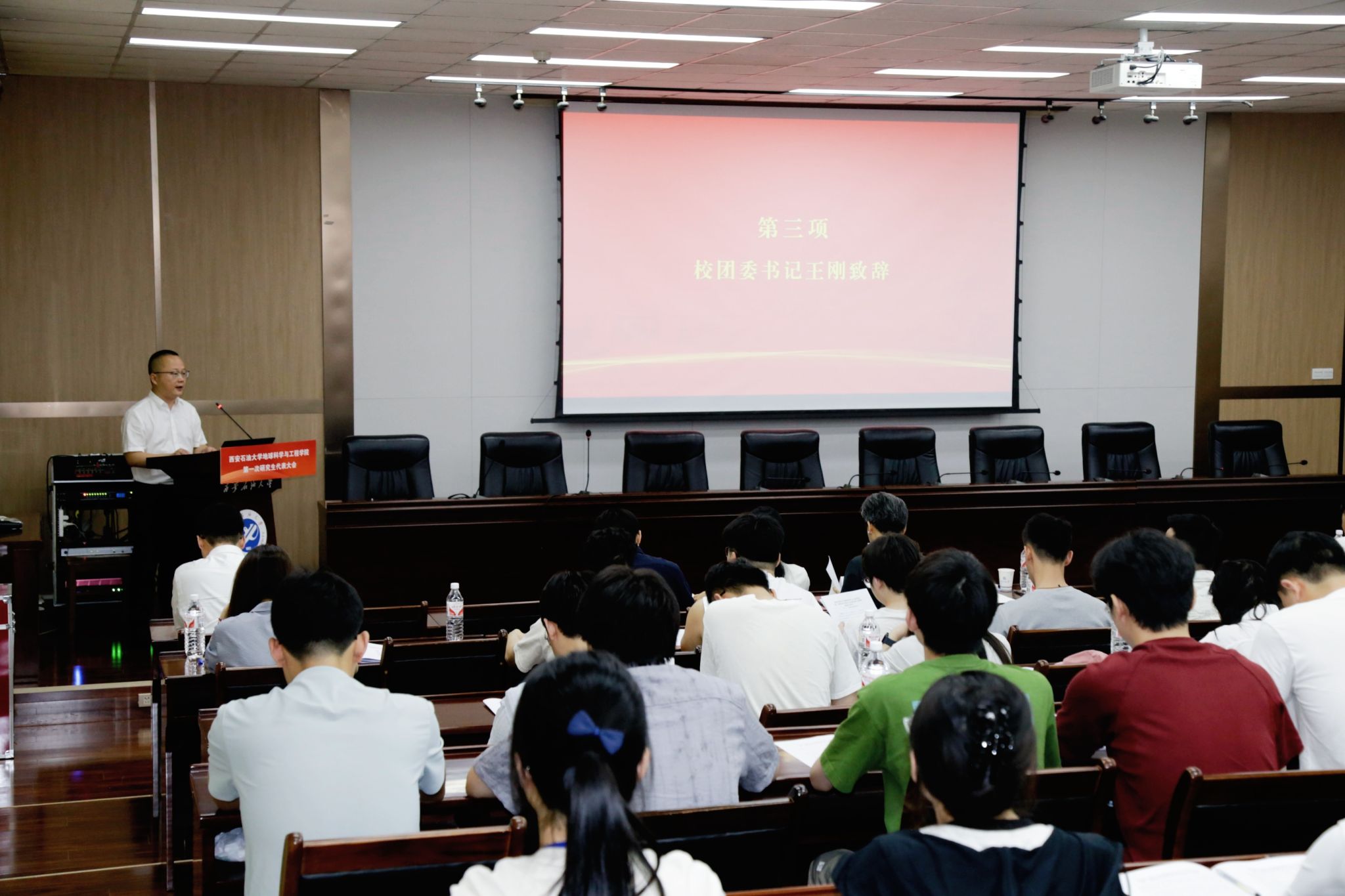 隨后,由校團(tuán)委書記王剛致辭,首先他代表校團(tuán)委對大會(huì)勝利召開表示熱烈祝賀,對學(xué)院長期以來研究生工作取得的成績給予充分肯定,并提出了三點(diǎn)希望。一是堅(jiān)守學(xué)術(shù)初心,以務(wù)實(shí)定力深耕專業(yè),恪守學(xué)術(shù)誠信,二是胸懷國家,將個(gè)人理想融入能源事業(yè),推動(dòng)學(xué)術(shù)成果轉(zhuǎn)化,三是強(qiáng)化責(zé)任擔(dān)當(dāng),通過研代會(huì)平臺(tái)參與校園治理,發(fā)揮橋梁作用,為同學(xué)辦實(shí)事,希望全院研究生以研代會(huì)為契機(jī),立大志、擔(dān)大任,在服務(wù)能源強(qiáng)國和現(xiàn)代化國家建設(shè)中綻放青春,并預(yù)祝大會(huì)圓滿成功。