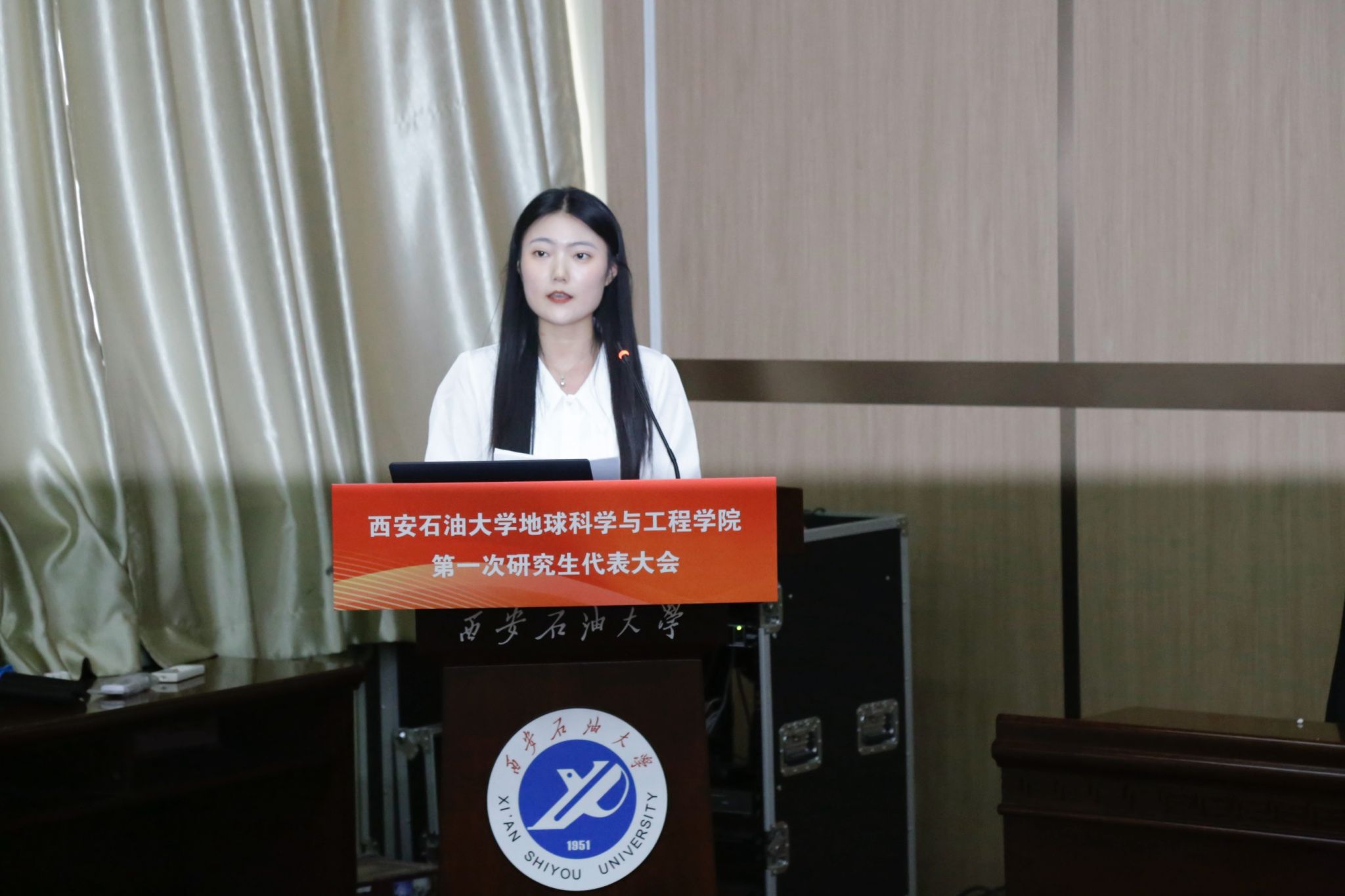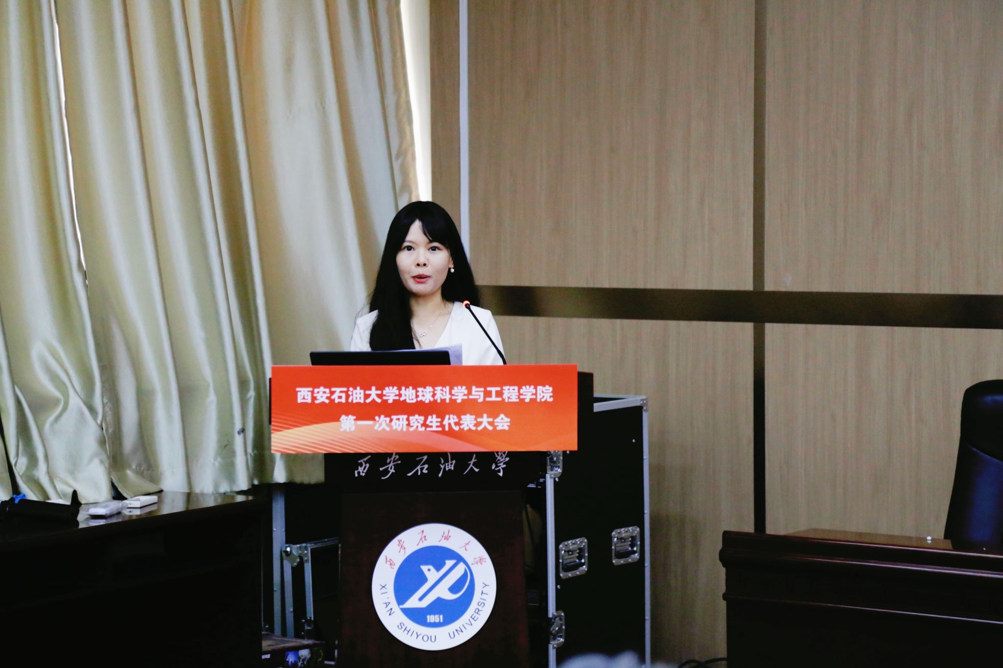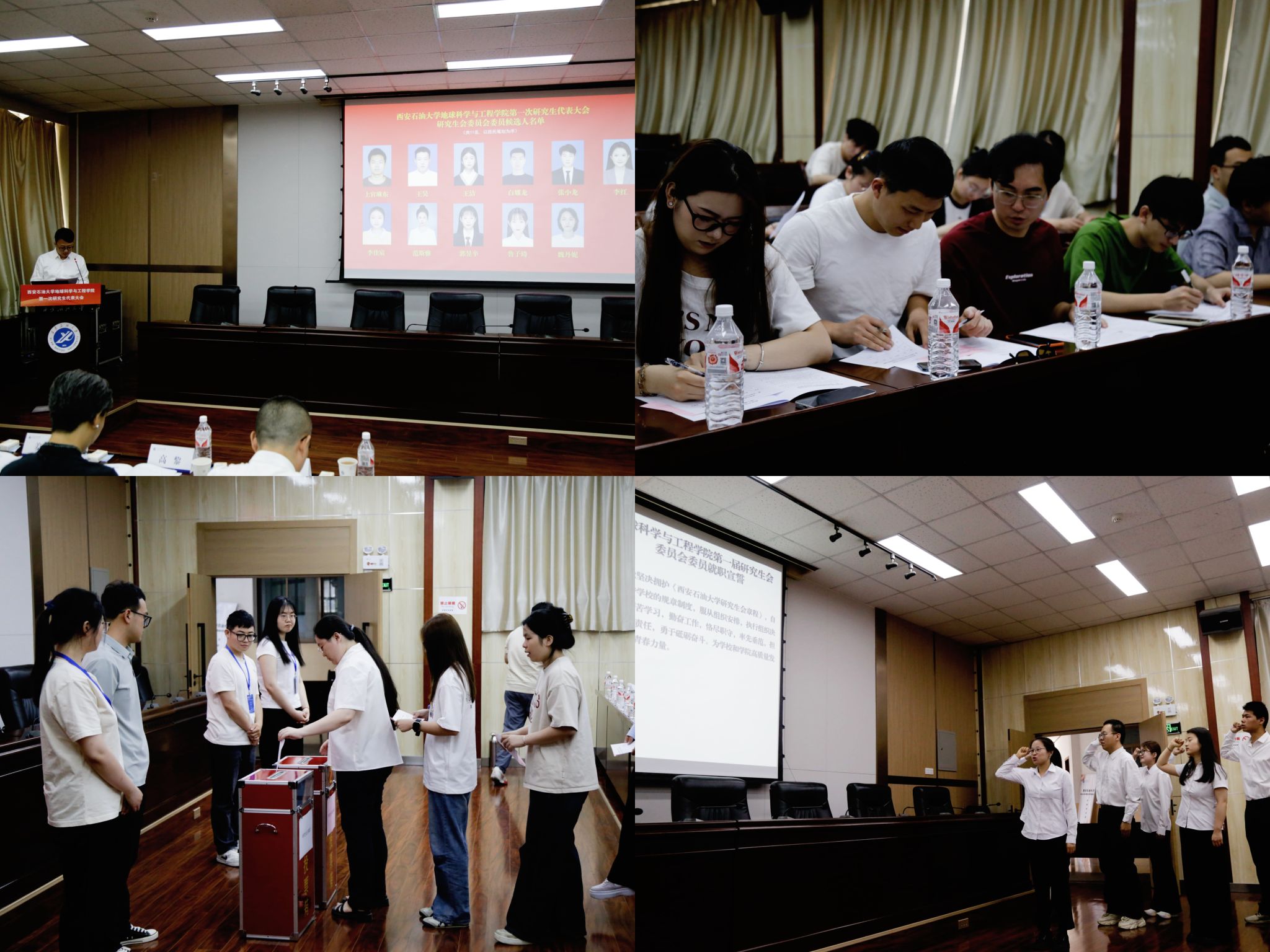 大會(huì)圓滿完成各項(xiàng)既定任務(wù),通過民主投票選舉產(chǎn)生了地球科學(xué)與工程學(xué)院第一屆研究生會(huì)委員會(huì)及主席團(tuán)成員。地球科學(xué)與工程學(xué)院第一屆研究生會(huì)委員會(huì)全體成員,面向團(tuán)旗就職宣誓。第一屆研究生會(huì)委員會(huì)代表范斯雅向大會(huì)作工作展望。最后,大會(huì)在全場齊唱的西安石油大學(xué)校歌《輝煌明天》中落下帷幕。會(huì)后,全體學(xué)生代表及參會(huì)嘉賓合影留念。