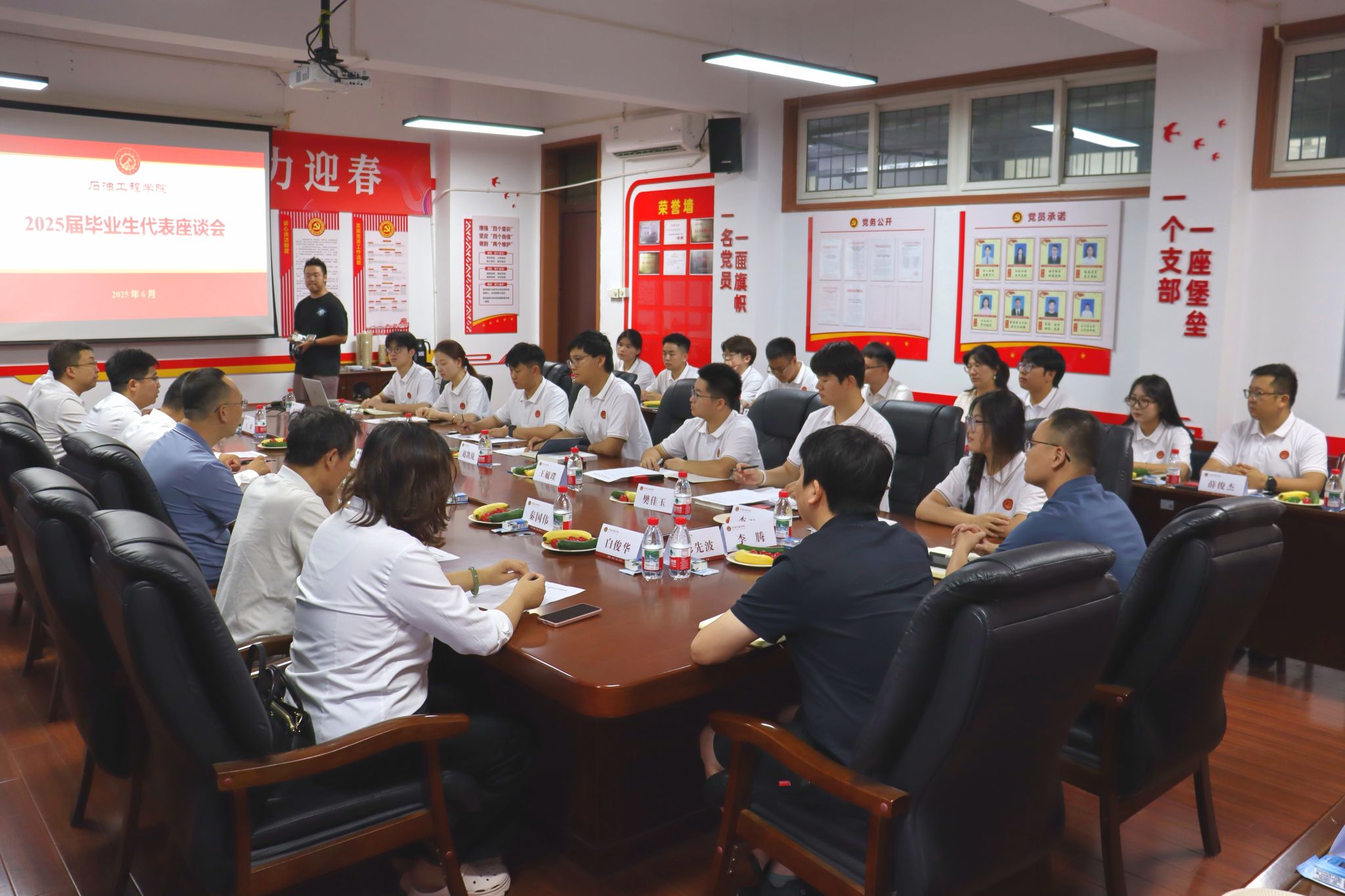 6月19日上午,學校畢業(yè)典禮和學院授位儀式結(jié)束后,石油工程學院在雁塔校區(qū)華油能源樓603會議室召開2025屆畢業(yè)生代表座談會,院長黃海,黨委副書記張浩然,副院長蔡文斌、王琛,學生工作辦公室副主任史陽,教師代表,畢業(yè)班輔導員與本碩博畢業(yè)生代表親切交流,共同回顧成長歷程、暢談美好未來愿景,座談會由張浩然主持。