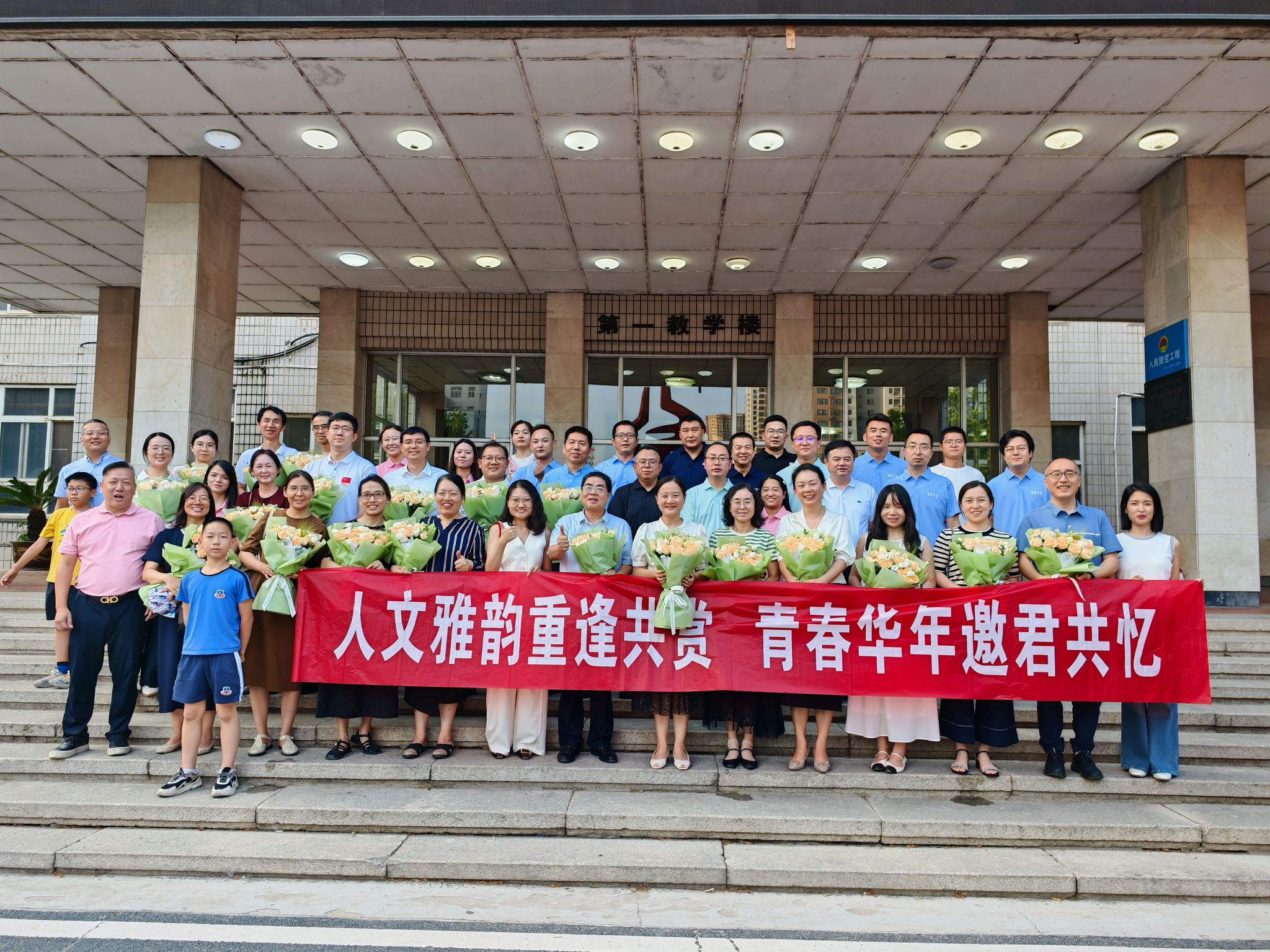 合影。2002級漢語言文學(xué)專業(yè)校友代表劉凱揚(yáng)為全體教師獻(xiàn)花,與會人員在教學(xué)樓前合影留念,鏡頭定格下了這難忘的一刻。每個人的臉上都洋溢著幸福的笑容,那是對過去美好時光的懷念,也是對未來共同發(fā)展的期待。