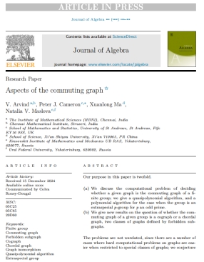 發(fā)表在Journal of Algebra的論文“Aspects of the commuting graph”主要研究了有限群的交換圖,全文共61頁(yè),作者順序按姓氏字母排列,依次為印度欽奈數(shù)學(xué)研究所V. Arvind教授、英國(guó)圣安德魯斯大學(xué)Peter J. Cameron教授、理學(xué)院馬儇龍副教授及俄羅斯科學(xué)院烏拉爾分院克拉索夫斯基數(shù)學(xué)和力學(xué)研究所首席研究員Natalia V. Maslova教授。群上交換圖的研究最早起源于1955年,本文系統(tǒng)探討了判定給定圖是否為有限群上交換圖的算法問(wèn)題,且針對(duì)超特殊p-群(p為奇素?cái)?shù)),給出了多項(xiàng)式算法。此外,就“分類(lèi)交換圖是余圖或弦圖時(shí)所對(duì)應(yīng)的有限群”這一公開(kāi)問(wèn)題進(jìn)行了深入研究;特別地,分類(lèi)了交換圖為余圖時(shí)的所有有限單群。該工作得到了國(guó)家自然科學(xué)基金項(xiàng)目的大力支持和資助。