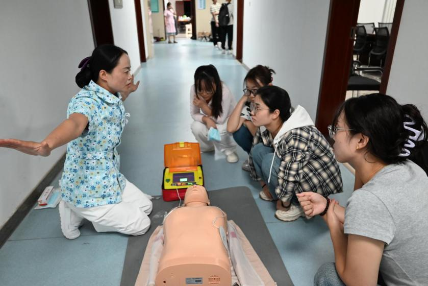 培訓以“技能操作”為核心內容,涵蓋心搏驟?,F(xiàn)場對成人進行心肺復蘇和使用自動體外除顫器(AED)、氣道異物梗阻現(xiàn)場應用海姆立克急救法救助病患,以及緊急傷口包扎等實操技能的演示教學。