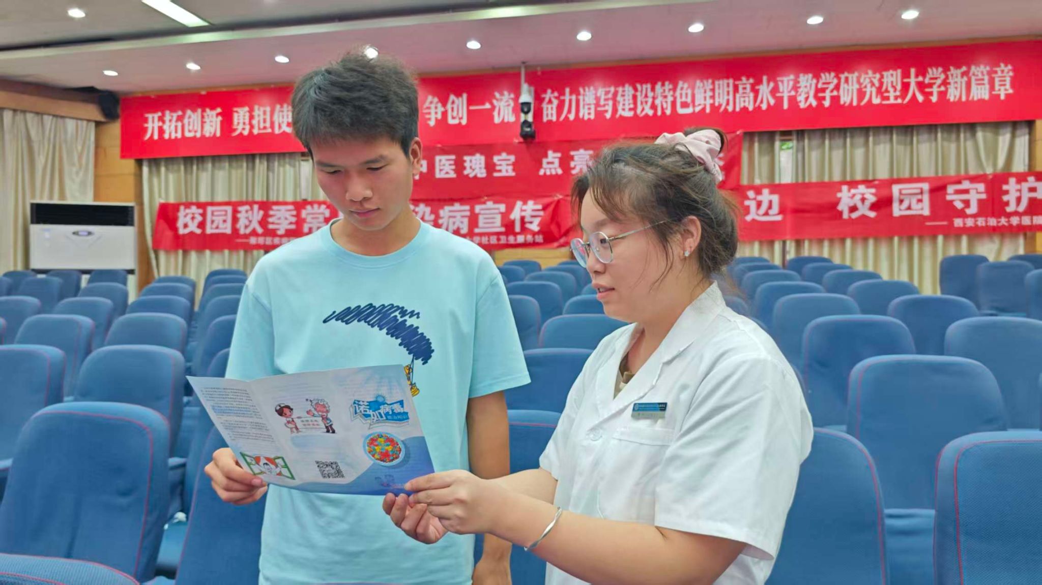 秋季是各類傳染病的高發(fā)期與傳染高峰期,為增強(qiáng)廣大新生的傳染病防控意識(shí),防止各類傳染病在校內(nèi)蔓延,雁塔區(qū)疾病預(yù)防控制中心副主任醫(yī)師李海軍帶來了結(jié)核病防治的相關(guān)知識(shí)和措施講解。他系統(tǒng)梳理了結(jié)核病的早期癥狀識(shí)別方法、規(guī)范治療流程以及校園防控重點(diǎn)舉措,內(nèi)容豐富且實(shí)用,讓新生們對(duì)傳染病的防治有了更深入的了解。為了鞏固傳染病健康教育成果,校醫(yī)院醫(yī)務(wù)人員在健康科普的同時(shí),向在場新生發(fā)放了傳染病防治健康知識(shí)宣傳手冊,并對(duì)同學(xué)進(jìn)行耐心講解和指導(dǎo),進(jìn)一步強(qiáng)化了廣大學(xué)生對(duì)傳染病防治重要性的認(rèn)識(shí)。