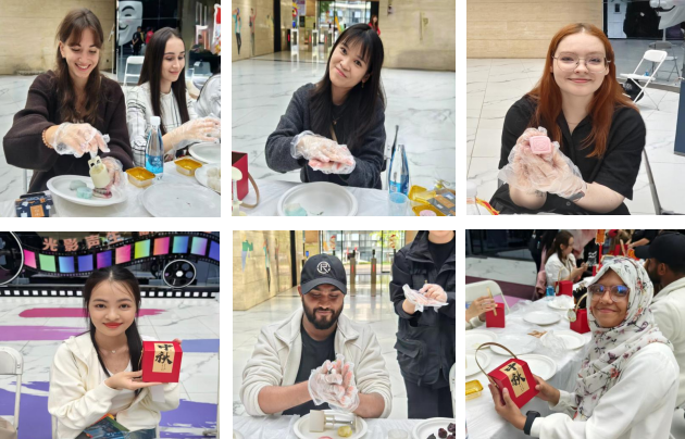 傳統(tǒng)民俗環(huán)節(jié),工作人員首先圍繞中秋節(jié)的歷史淵源、文化內(nèi)涵,以及不同地域特色的月餅種類進行詳細講解,重點介紹了冰皮月餅的制作工藝。隨后,工作人員現(xiàn)場演示了冰皮月餅從制皮、包餡到壓模成型的完整過程,清晰的步驟講解與直觀的操作示范,讓留學生們躍躍欲試。在接下來的實踐環(huán)節(jié),留學生們兩兩一組、默契配合,親手揉制冰皮、包裹餡料、按壓模具,一個個造型精致、花紋清晰的冰皮月餅逐漸成型。活動現(xiàn)場歡聲笑語不斷,濃郁的中秋節(jié)日氛圍在動手實踐的樂趣中愈發(fā)濃厚。