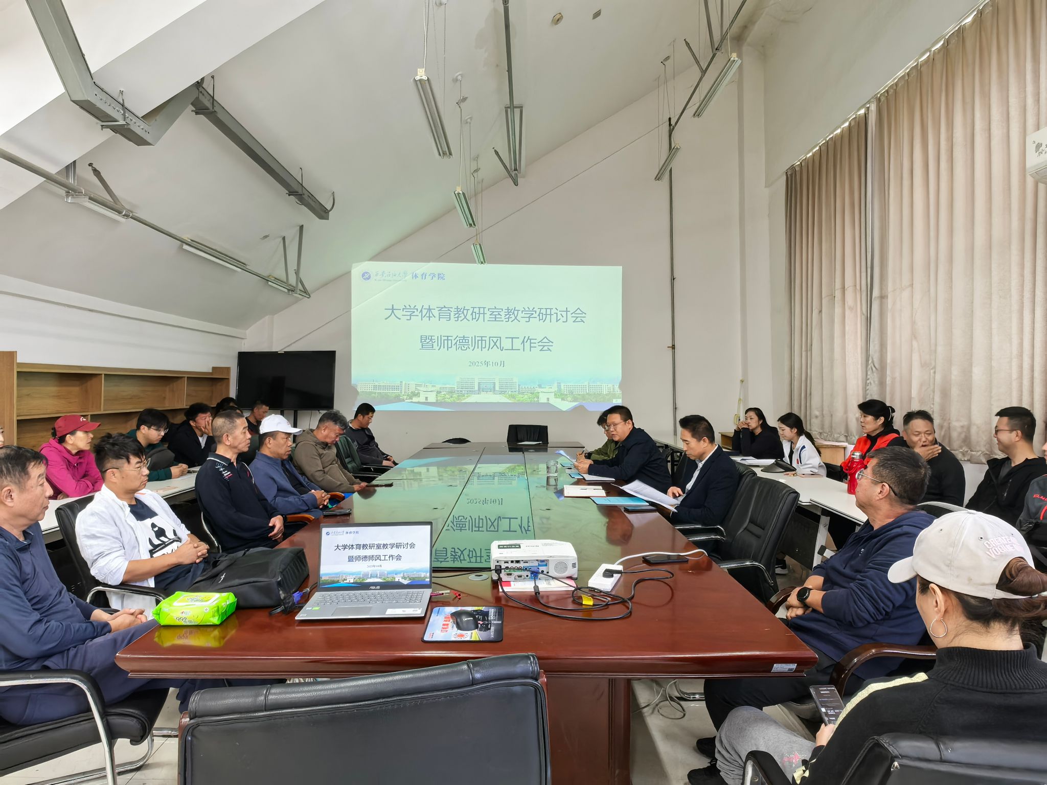 10月15日,體育學(xué)院在鄠邑校區(qū)學(xué)院會(huì)議室召開(kāi)大學(xué)體育課程教學(xué)研討會(huì)暨師德師風(fēng)工作會(huì),本次教研活動(dòng)主題為“筑牢師德師風(fēng),深化課程改革,提高課堂教學(xué)效率”。體育學(xué)院黨政領(lǐng)導(dǎo)劉小波、李壽邦、阮凌,大學(xué)體育教研室主任劉丹青和全體大學(xué)體育教研室教師參加會(huì)議。會(huì)議由體育學(xué)院副院長(zhǎng)阮凌主持。