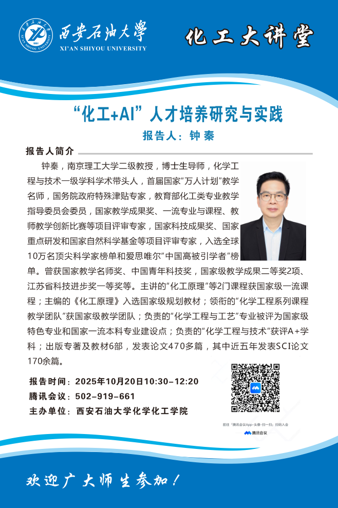 本次“化工大講堂”的順利舉辦,不僅為我校教師搭建了與化工專業(yè)教育教學領域頂尖專家對話的平臺,更有助于教師在AI背景下拓寬大學課程改革視野,利用先進技術(shù)手段進一步提升教學質(zhì)量與科研創(chuàng)新能力,推動我院化工學科建設與高素質(zhì)人才培養(yǎng)質(zhì)量。