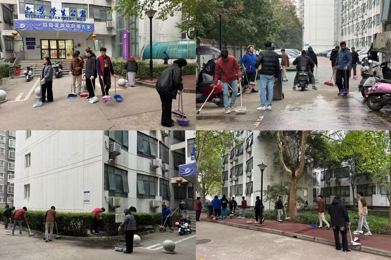 隨后,學(xué)生分組積極投入勞動(dòng),清理國(guó)際學(xué)生公寓樓及周邊停車(chē)場(chǎng)、綠化帶等區(qū)域:樓內(nèi)細(xì)致擦拭樓梯扶手、清理公共廚房雜物;樓外清掃廢紙煙頭、俯身?yè)焓安萜毫阈抢?。學(xué)生們干勁十足,在協(xié)作中提升勞動(dòng)技能、增進(jìn)友誼,紛紛表示親手美化“家園”,既讓居住環(huán)境煥然一新,更增強(qiáng)了學(xué)在校園、住在校園歸屬感與責(zé)任感。