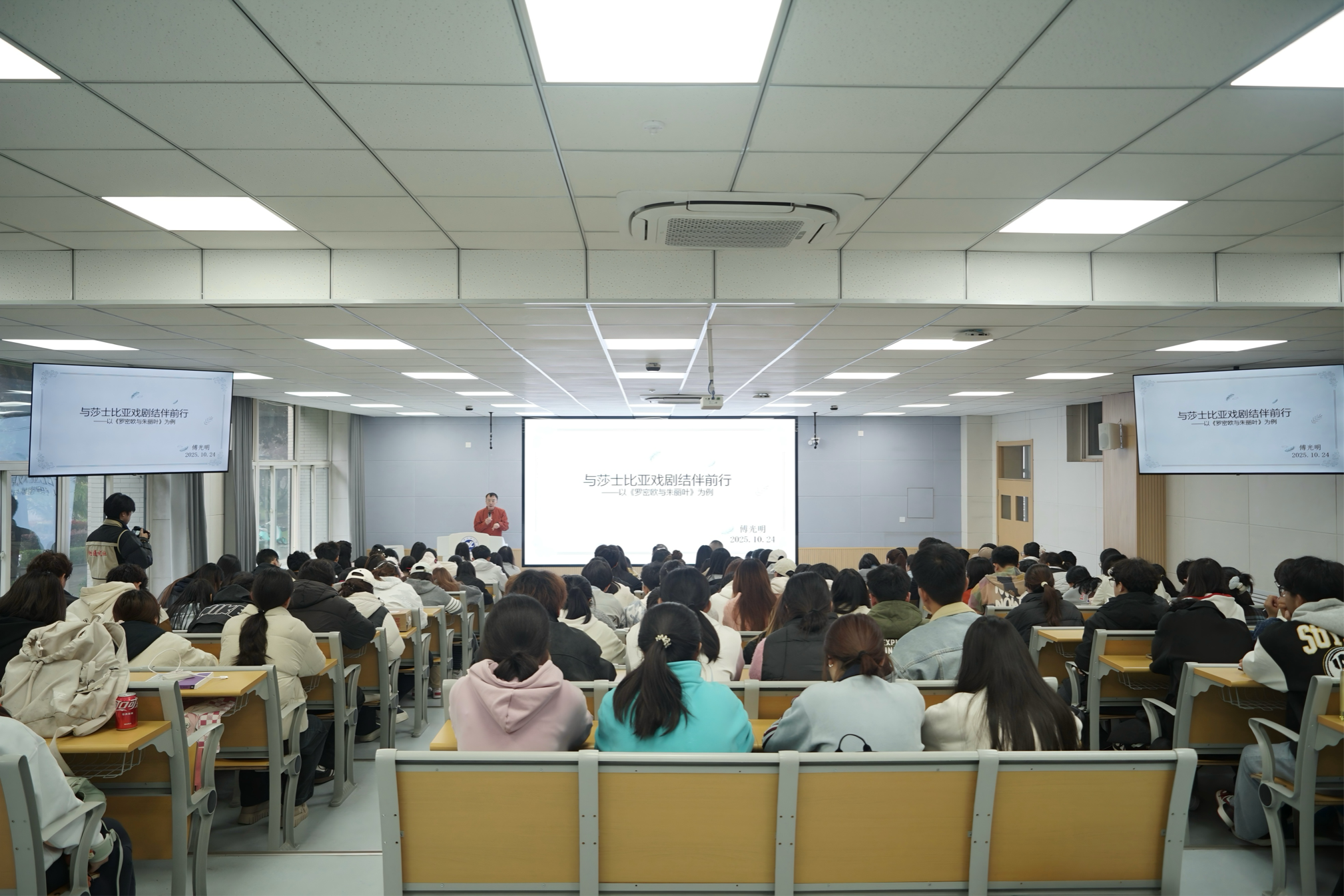 10月24日下午,由校團(tuán)委主辦的第94期明德講堂在鄠邑校區(qū)博覽樓A110智慧大講堂舉辦。本期講堂特邀首都師范大學(xué)外國語學(xué)院教授、博士研究生導(dǎo)師傅光明教授,為我校師生作題為《與莎士比亞戲劇結(jié)伴前行—以<羅密歐與朱麗葉>為例》的專題報(bào)告。副校長種宇宏出席報(bào)告會(huì),校團(tuán)委書記王剛主持報(bào)告會(huì)。