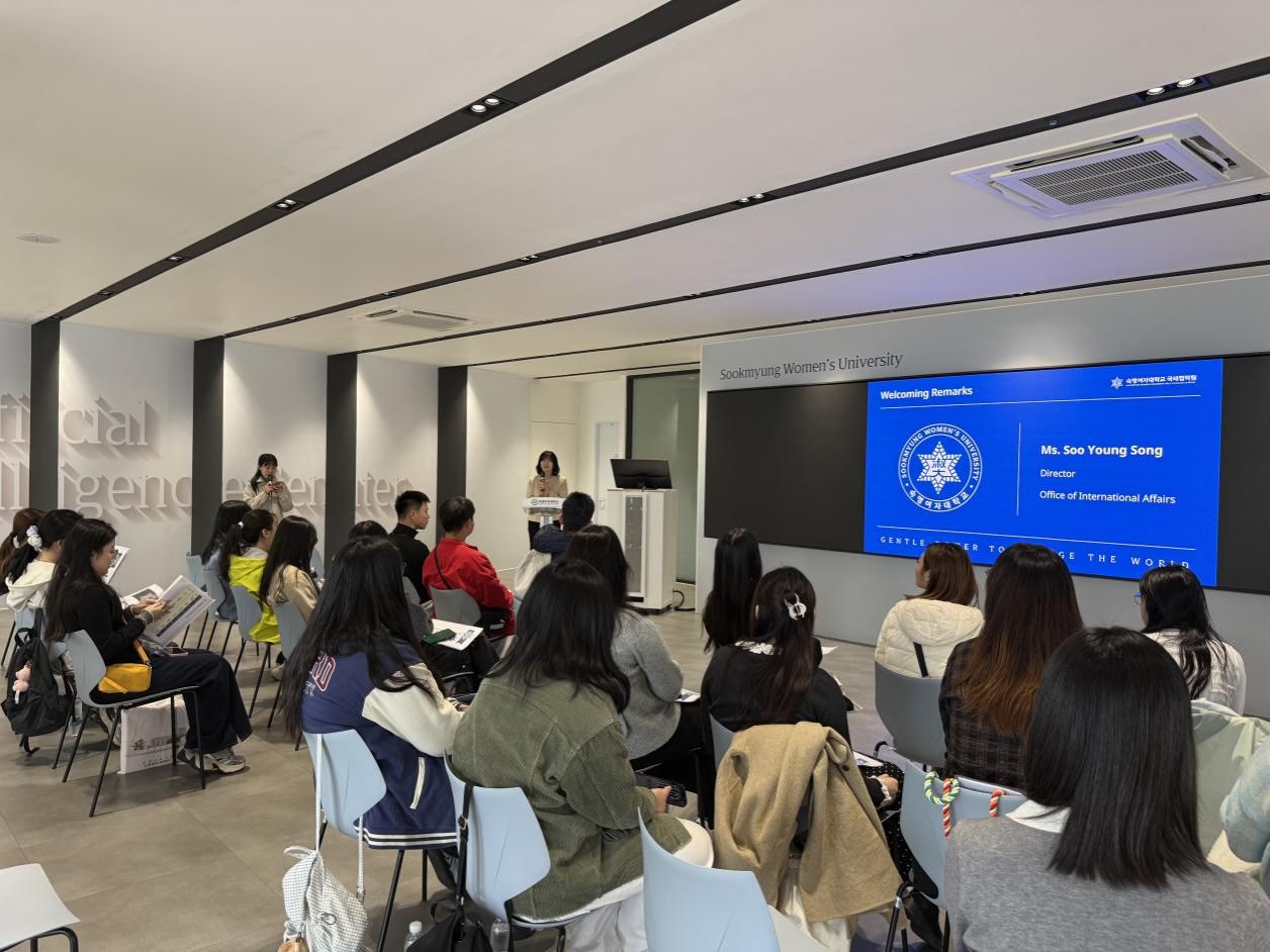 項目伊始,淑明女子大學(xué)為研習(xí)團舉行了溫馨的歡迎儀式。淑明女子大學(xué)國際處國際協(xié)力組&留學(xué)生服務(wù)組組長宋秀英對師生們的到來表示熱烈歡迎,并詳細(xì)介紹了未來幾天的學(xué)習(xí)安排與體驗計劃。她鼓勵同學(xué)們在課程學(xué)習(xí)中多感受、多體會,真正融入校園氛圍,深入理解韓國文化,收獲充實而難忘的交流經(jīng)驗。