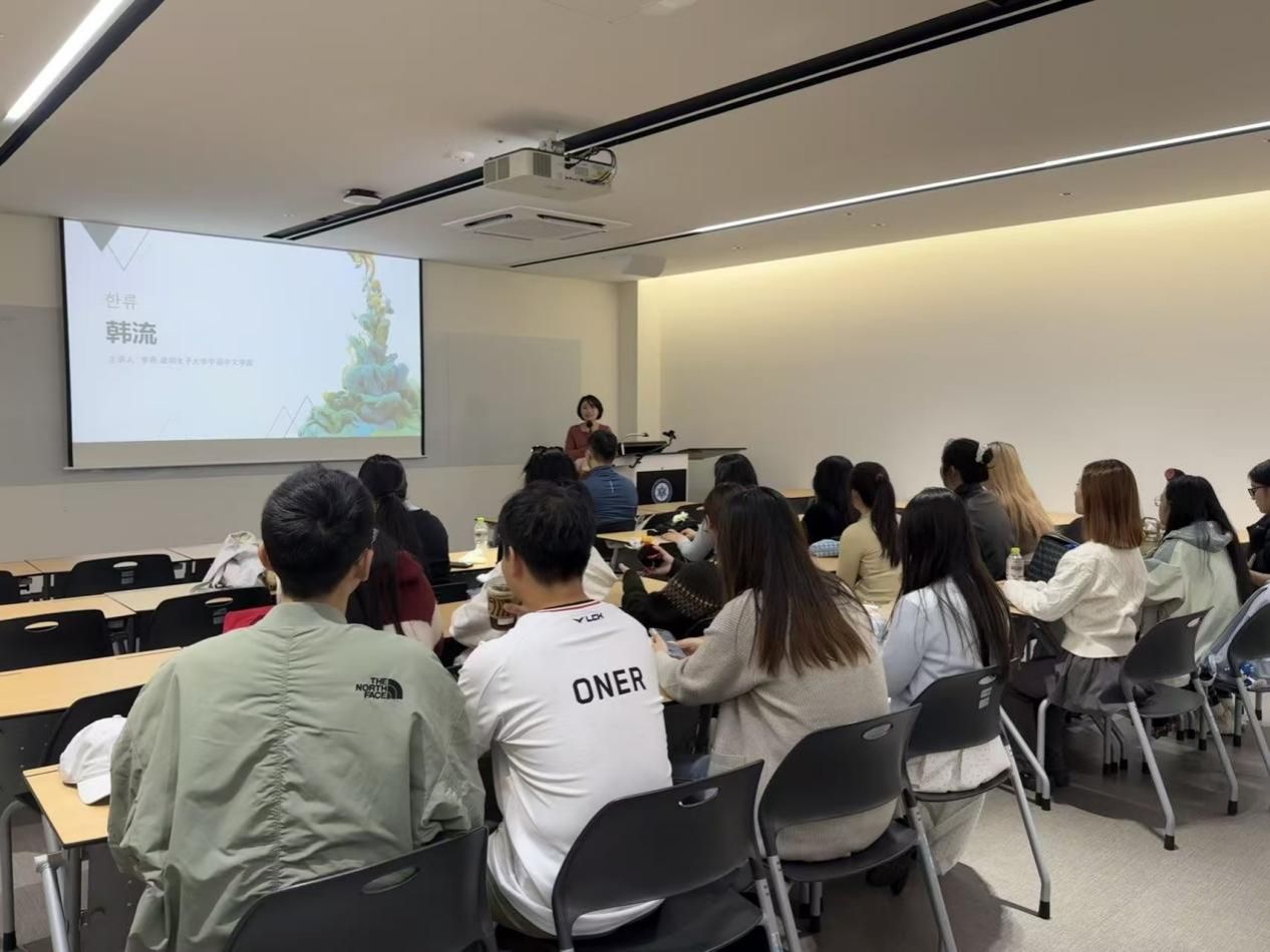 李燕教授帶來的《韓流》專題研討,則從文化研究的維度展現(xiàn)了韓國軟實力。通過詳實的數(shù)據(jù)分析和生動的案例展示,系統(tǒng)闡釋了韓國流行文化在影視制作、音樂產(chǎn)業(yè)、時尚美妝等領(lǐng)域的創(chuàng)新實踐與全球傳播策略。講座現(xiàn)場,師生圍繞文化創(chuàng)新、青年責(zé)任等議題展開討論,思維的火花在交流中不斷迸發(fā)。