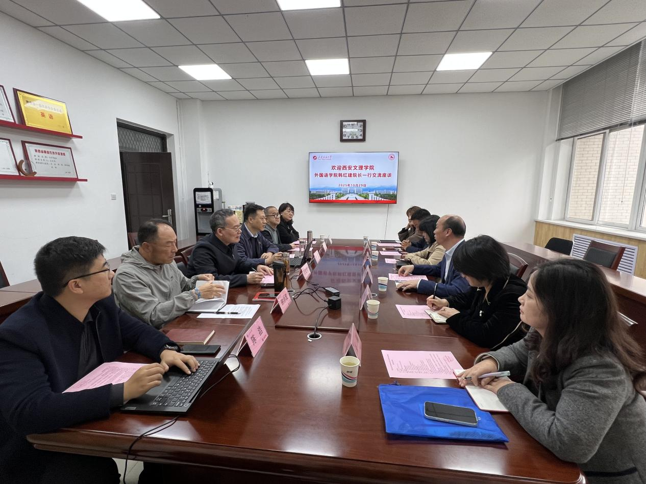 10月29日,西安文理學(xué)院外國語學(xué)院院長(zhǎng)韓紅建一行6人蒞臨我校外國語學(xué)院座談交流。座談交流會(huì)在鄠邑校區(qū)崇文樓314會(huì)議室召開。雙方學(xué)院黨政領(lǐng)導(dǎo)和骨干教師代表圍繞辦學(xué)思路、人工智能發(fā)展背景下外語學(xué)科發(fā)展思路的思考和實(shí)踐、課程設(shè)置、課程體系建設(shè)、教學(xué)改革、人才培養(yǎng)質(zhì)量等議題展開交流探討。