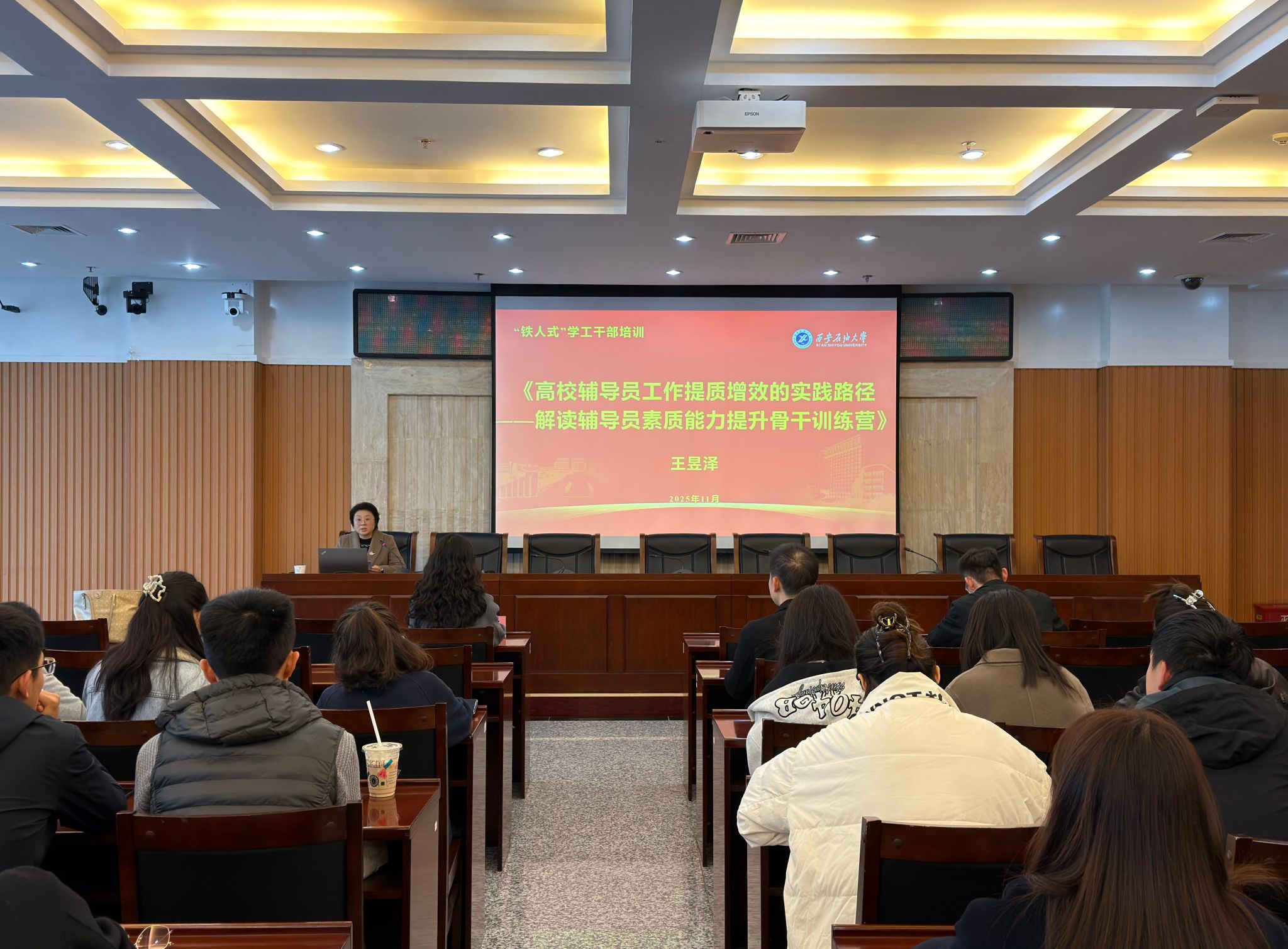 為進(jìn)一步提升我校學(xué)工干部專業(yè)素養(yǎng)與工作實(shí)效,落實(shí)立德樹人根本任務(wù),11 月 3 日上午,我校在鄠邑校區(qū)圖書館第一會(huì)議室舉辦 “鐵人式” 學(xué)工干部培訓(xùn)第七講。本次培訓(xùn)邀請西北農(nóng)林科技大學(xué)資源環(huán)境學(xué)院團(tuán)委書記兼學(xué)生工作秘書王昱澤,作《高校輔導(dǎo)員工作提質(zhì)增效的實(shí)踐路徑 —— 解讀輔導(dǎo)員素質(zhì)能力提升骨干訓(xùn)練營》專題報(bào)告。培訓(xùn)由學(xué)生工作部副部長畢軼慧主持,全體學(xué)工干部參加。