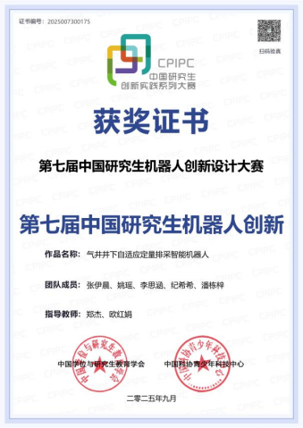 9月26日至29日,第七屆中國研究生機(jī)器人創(chuàng)新設(shè)計(jì)大賽全國總決賽在山東省濟(jì)南市融創(chuàng)國際會(huì)議中心隆重舉辦。本屆大賽報(bào)名啟動(dòng)以來,全國224家培養(yǎng)單位的1545支隊(duì)伍參賽,較去年增加330余支。為保證大賽評(píng)審工作公平公正,大賽組委會(huì)邀請(qǐng)70家單位159位專家擔(dān)任初賽評(píng)委。8月27日大賽初賽評(píng)審?fù)瓿?,最終來自104家培養(yǎng)單位的325支隊(duì)伍入圍決賽。我校機(jī)械工程學(xué)院“氣井井下自適應(yīng)定量排采智能機(jī)器人”作品獲得全國三等獎(jiǎng),團(tuán)隊(duì)成員有張伊晨、姚瑤、李思涵、紀(jì)希希、潘棟梓,鄭杰、歐紅娟任指導(dǎo)教師。