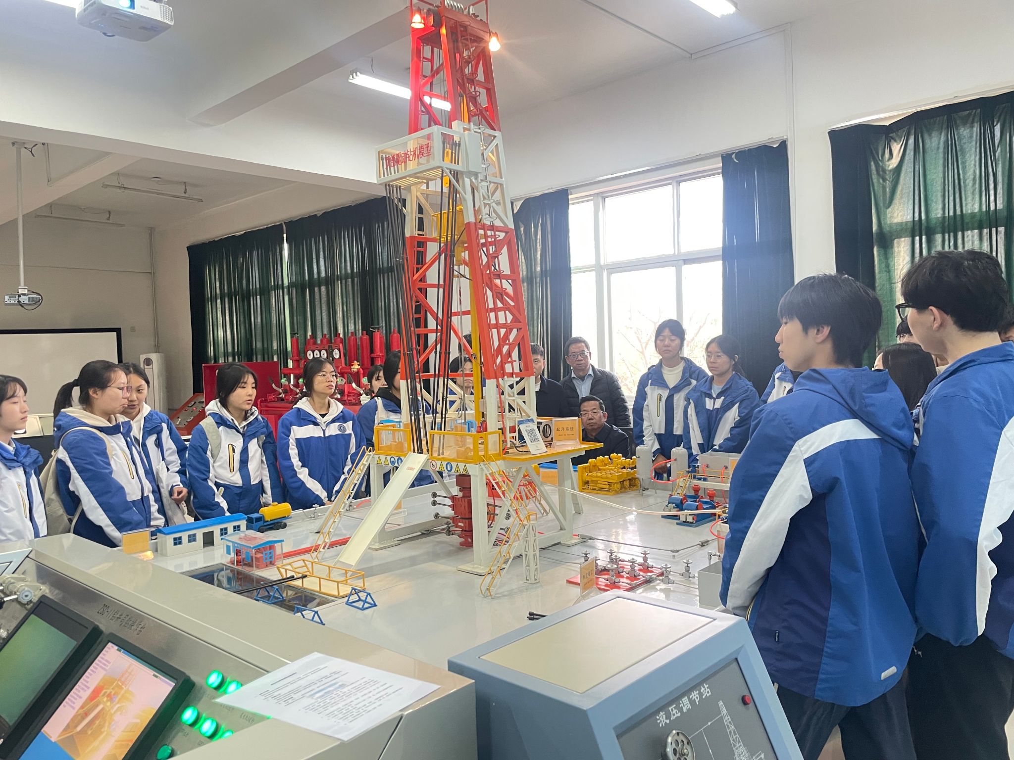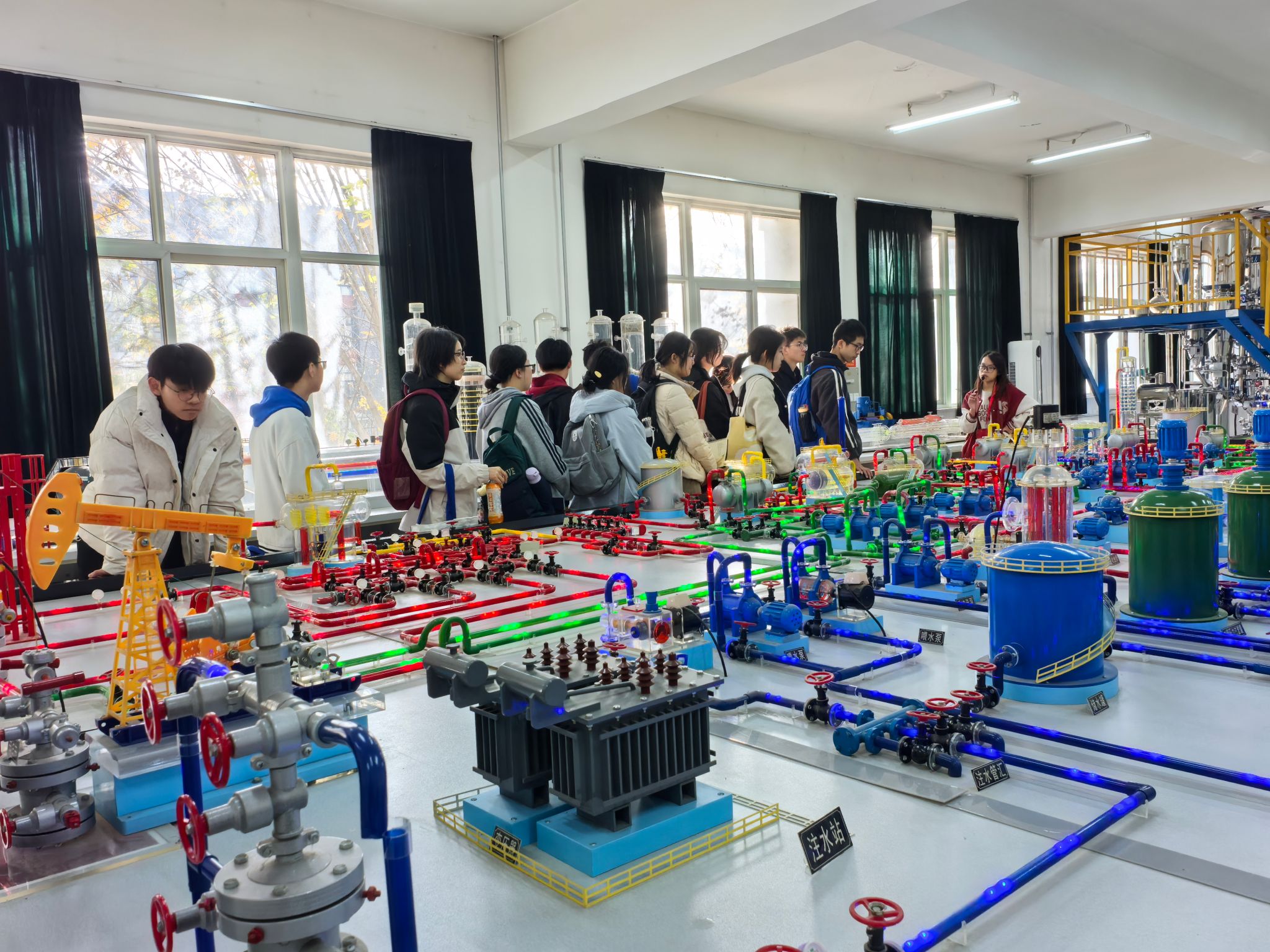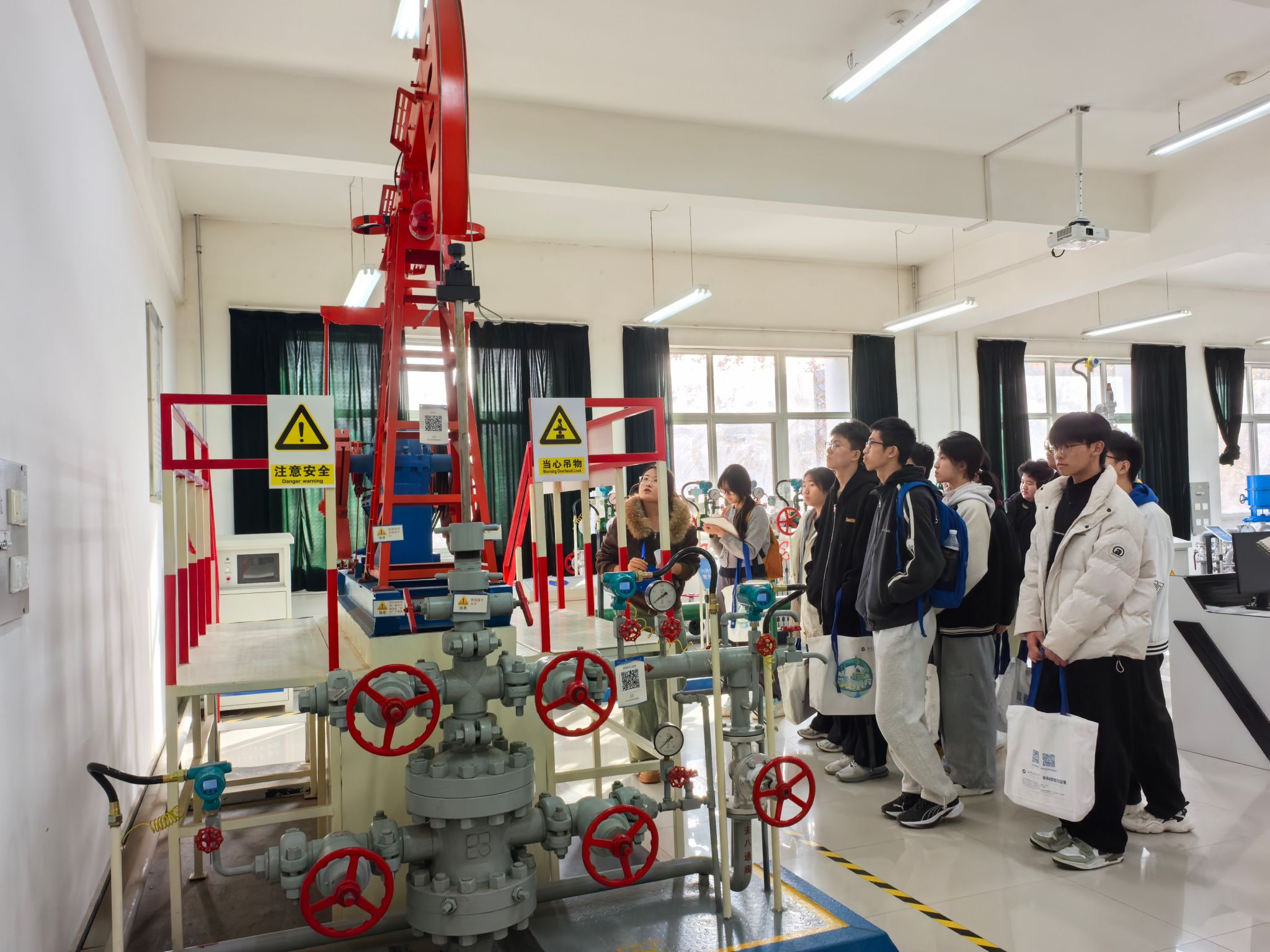 研學活動最后一站參觀了我校陜西省石油石化虛擬仿真實驗教學中心。在大學生講解員的帶領下,五高師生參觀了鉆井實訓室、地質標本實訓室、采油實訓室、油氣分布沙盤、集輸、煉化實訓室、采油實訓室。通過參觀學習,學生初步了解了石油勘探、開采、煉化和運輸?shù)娜^程,近距離感受到了石油石化及地質行業(yè)的魅力與挑戰(zhàn)。