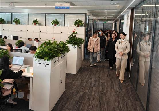 在工作人員引導(dǎo)下,師生一行參觀了事務(wù)所的審計(jì)一部、工程造價(jià)部、技術(shù)支持部及員工共享空間等。通過實(shí)地走訪,同學(xué)們對(duì)事務(wù)所的組織架構(gòu)與業(yè)務(wù)流程有了更為直觀的認(rèn)識(shí),切身感受到立信嚴(yán)謹(jǐn)專業(yè)的工作氛圍和以人為本的員工關(guān)懷,深刻體會(huì)到其團(tuán)隊(duì)協(xié)作精神與客戶服務(wù)理念。