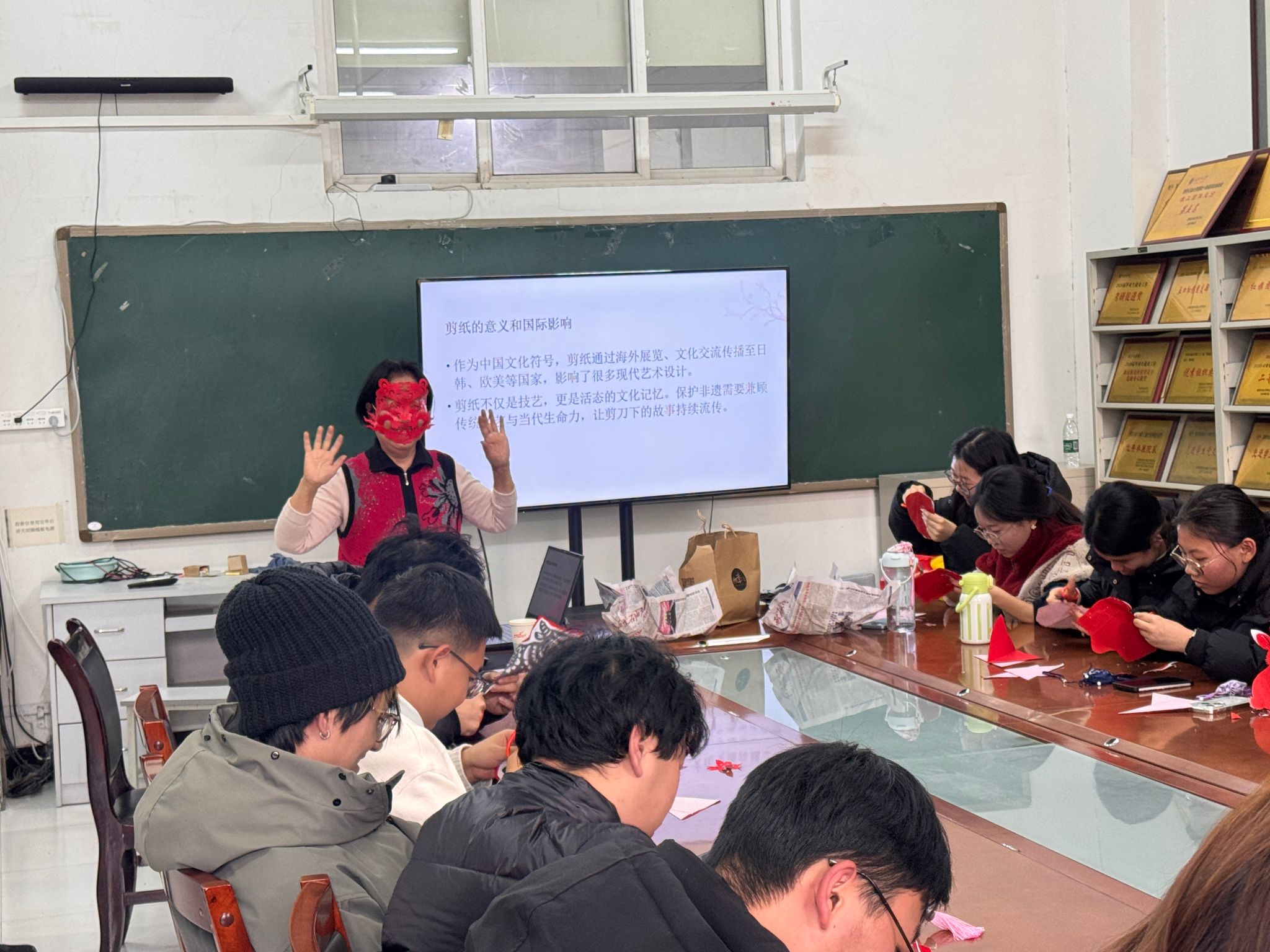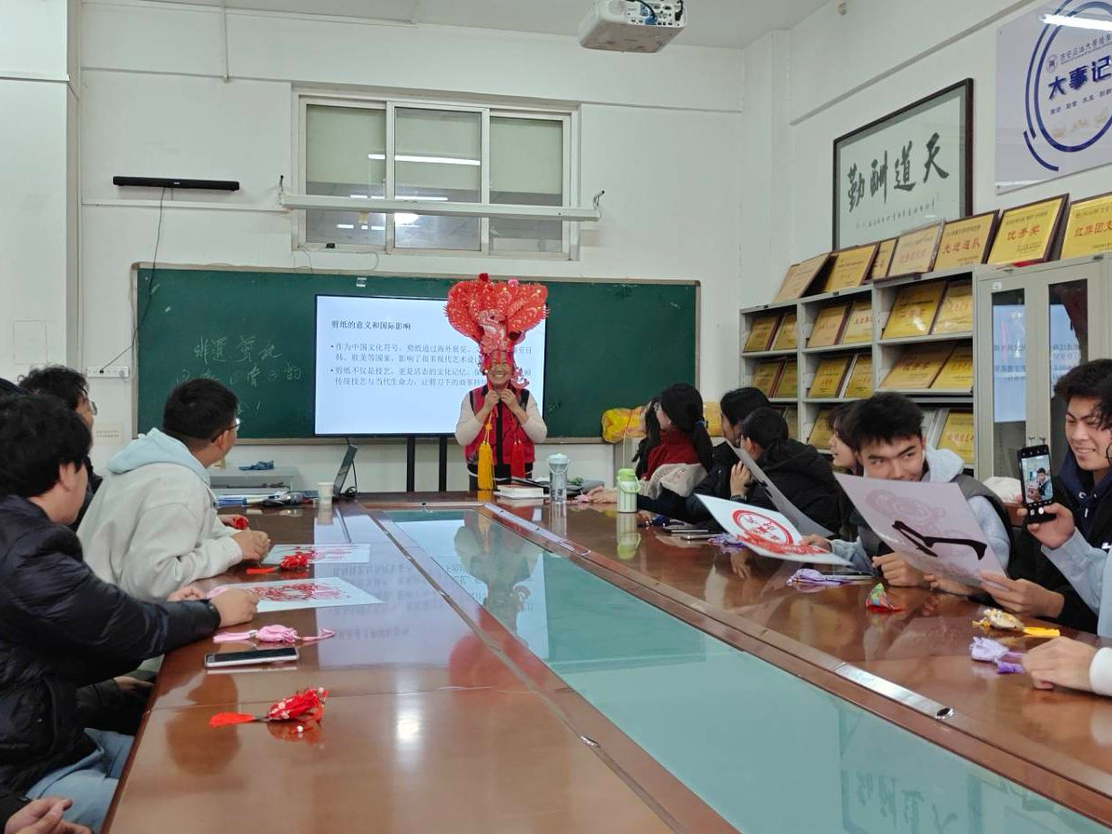 活動現場,78歲的肖志賢老人以輕松幽默的語言和深入淺出的講解,為同學們系統(tǒng)梳理了剪紙藝術的起源、內容與地域特色。從吉祥文字到神話傳說,從十二生肖到花鳥蟲魚,她不僅生動解讀了剪紙背后的民俗信仰與生命禮俗,更以“諧音象征”為例,巧妙串聯起中國人的生活哲學與樂觀智慧。講解過程中,金句頻出、妙趣橫生,引得現場笑聲不斷,掌聲迭起。