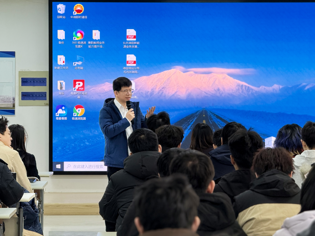 在座談會(huì)上,校友蔣守強(qiáng)以長(zhǎng)慶油田新能源業(yè)務(wù)發(fā)展及項(xiàng)目管理為題就油氣與新能源融合技術(shù)的現(xiàn)場(chǎng)應(yīng)用為同學(xué)們做了介紹。新能源學(xué)院副院長(zhǎng)張明從圍繞“什么是新能源”“國(guó)家為什么要發(fā)展新能源”“油田企業(yè)新能源應(yīng)用發(fā)展趨勢(shì)”等三個(gè)問(wèn)題展開(kāi)系統(tǒng)講授,讓同學(xué)們了解到相較傳統(tǒng)能源新能源的發(fā)展優(yōu)勢(shì)、當(dāng)前國(guó)際國(guó)內(nèi)形勢(shì)下國(guó)家發(fā)展新能源的必要性以及未來(lái)油田企業(yè)對(duì)新能源人才的需求等。隨后研究生們圍繞油氣行業(yè)發(fā)展趨勢(shì)、長(zhǎng)慶油田對(duì)人才的招聘需求以及個(gè)人在油氣行業(yè)的未來(lái)發(fā)展與蔣守強(qiáng)校友及張明副院長(zhǎng)進(jìn)行了互動(dòng)交流,現(xiàn)場(chǎng)氣氛熱烈。