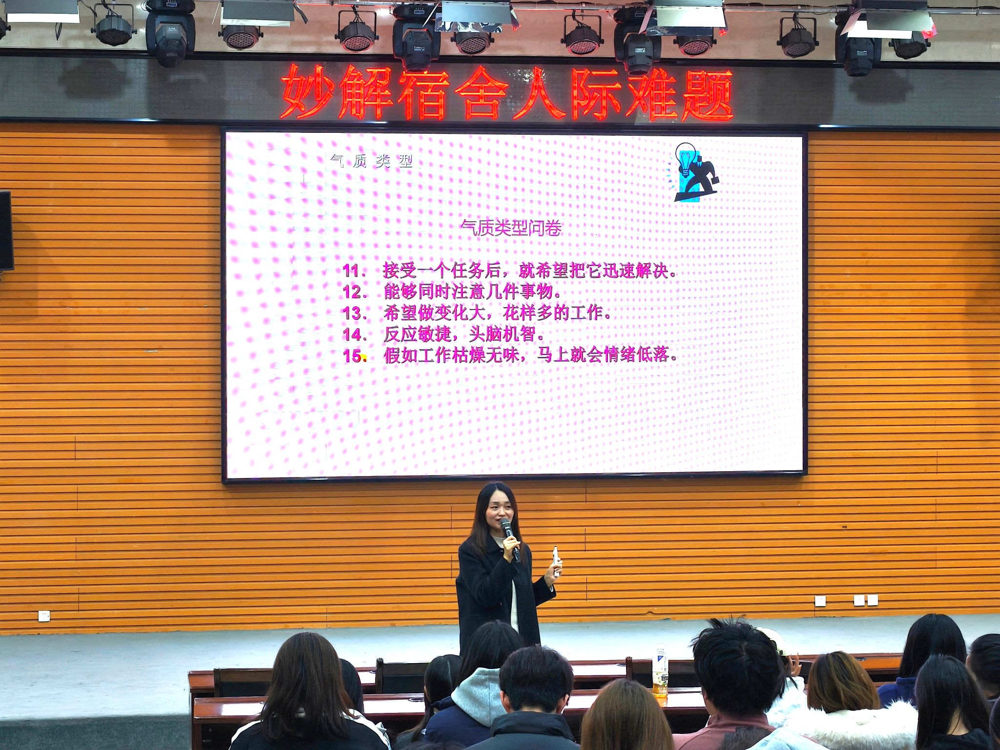 為助力學(xué)生營造穩(wěn)定的學(xué)習(xí)生活環(huán)境,建立積極健康的人際關(guān)系,更好地適應(yīng)大學(xué)集體生活,11月28日,人文學(xué)院于崇文樓118多功能會議室舉辦“妙解宿舍人際難題”心理講座。本次講座特邀西安石油大學(xué)心理成長指導(dǎo)中心專職心理咨詢師、國家二級心理咨詢師趙晶老師主講,2025輔導(dǎo)員張馨元及全體學(xué)生參加。